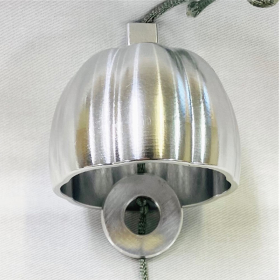 金型材料のアルミを活用して製作した『アルミ風鈴』になります。ガラスや陶器、鋳物の風鈴とはひと味違う、優しく澄んだ音色が楽しめます。