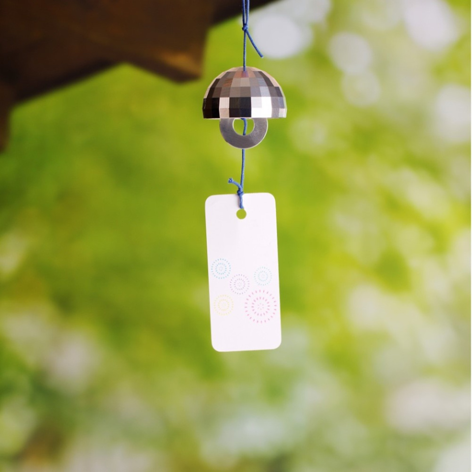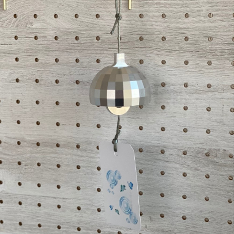 まるでミラーボールのような煌めきの風鈴を作りました。風に舞いながら、光と音色で癒しをお届けします。