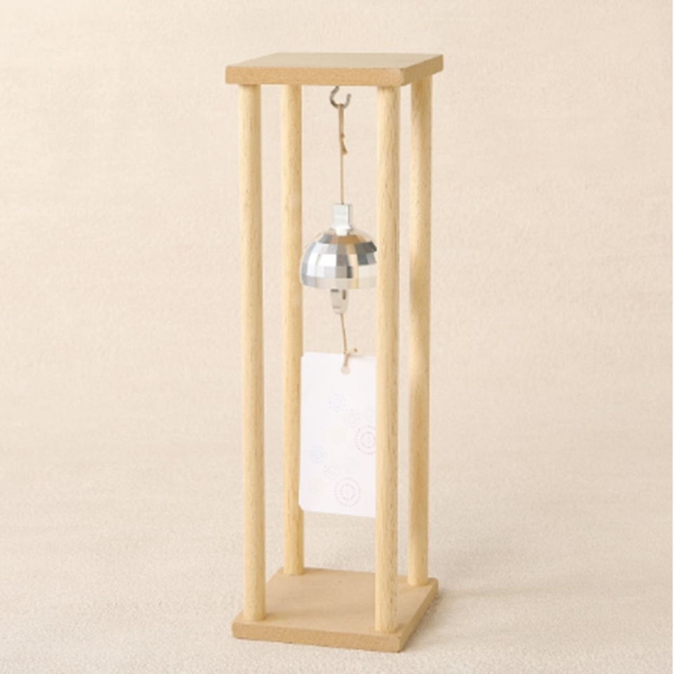 軒先などに吊るして風に揺れる様子が楽しい風鈴ですが、「音がご近所の迷惑になるのでは…」とご心配の声をいただきました。そこで、室内で飾っていただけるように、スタンドを作りました。お好きな場所で、優しく澄んだ音色の『アルミ風鈴』をお楽しみください。
