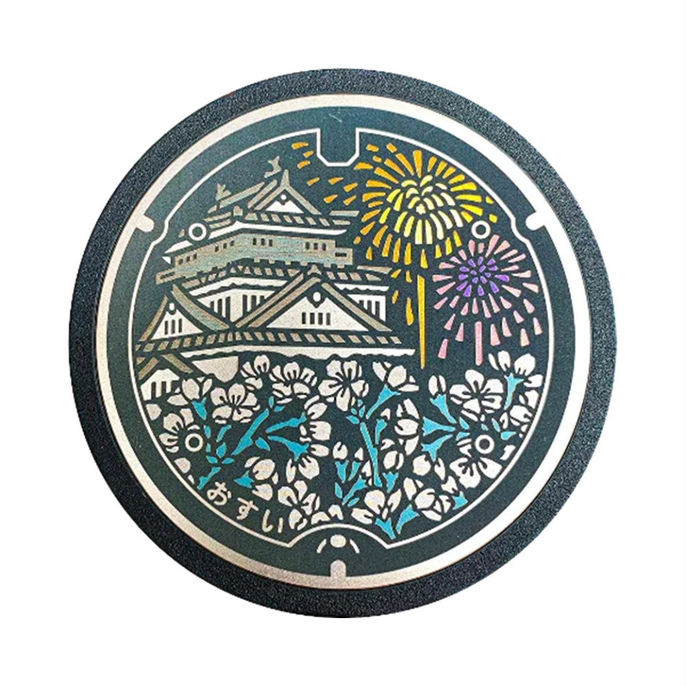 ヤスオカのチタン製ミニチュアマンホールはレーザー技術による構造色で作成し、繊細な色でマンホールの再現性を高めています。