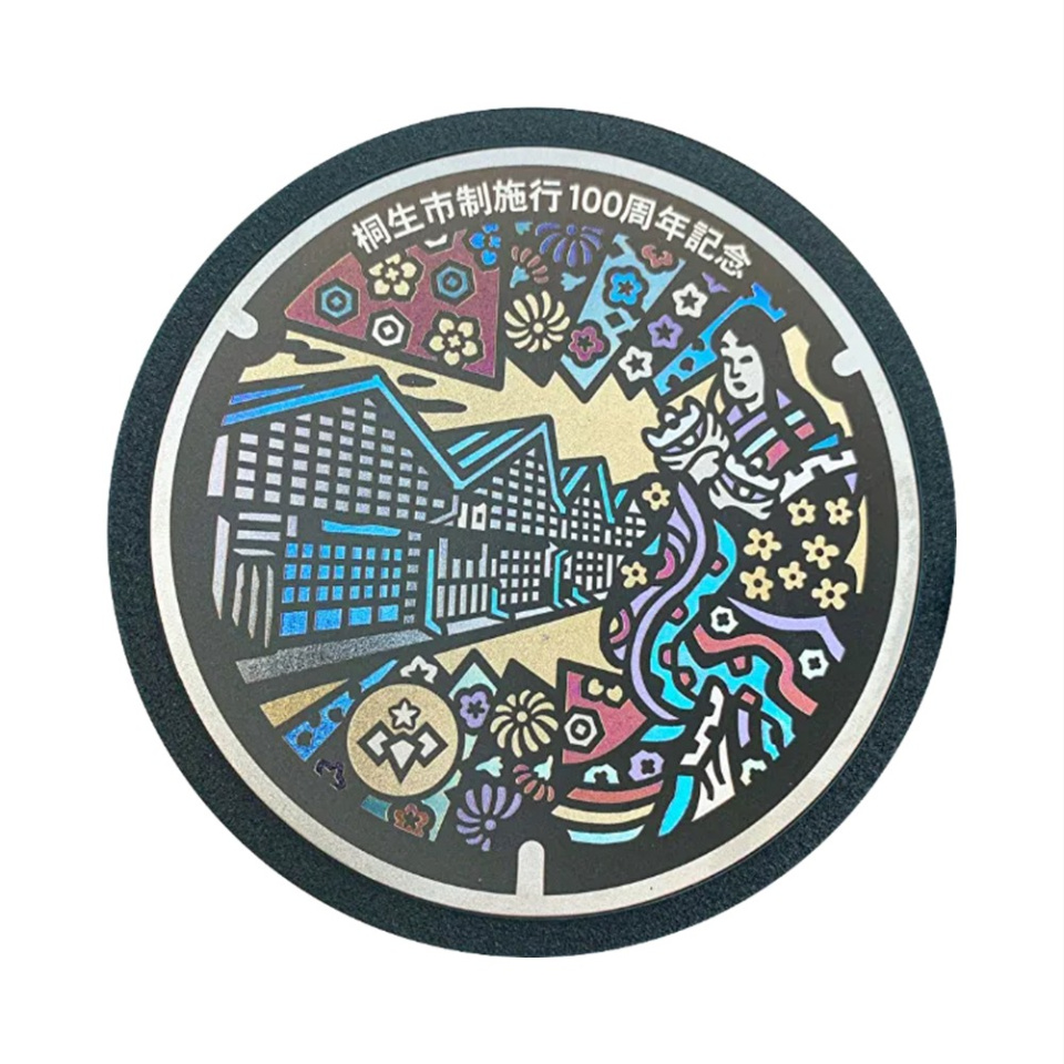 桐生市発展の礎「絹織物業」は奈良時代までさかのぼります。大和地方から絹織物業の技術が伝えられたと言われる「白滝姫伝説」と桐生織物のシンボル的建築物である「ノコギリ屋根工場」をモチーフとした、市制施行100周年記念のカラーマンホール蓋。