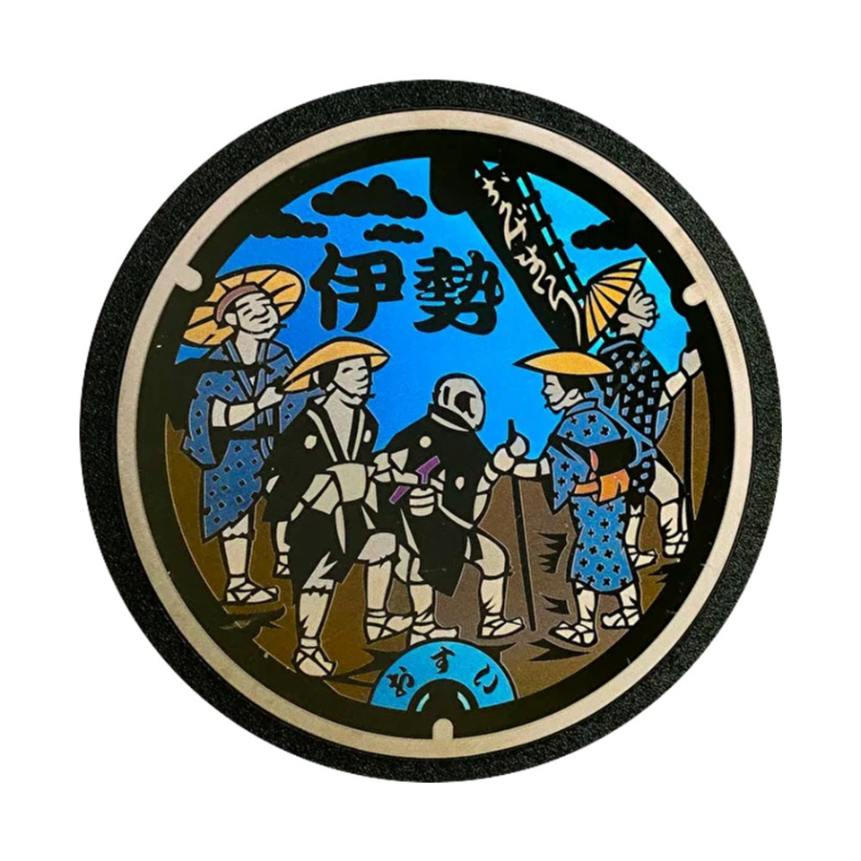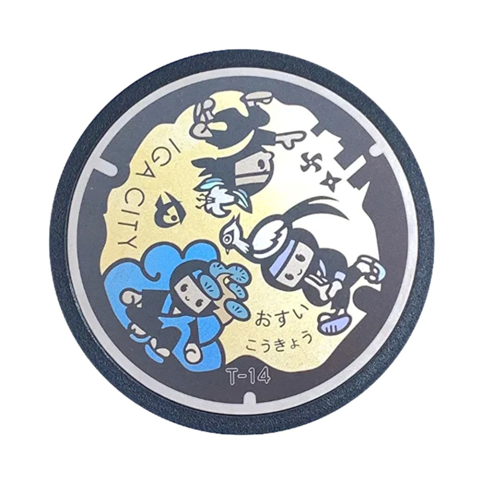 伊賀流忍者発祥の地である伊賀市。伊賀忍者は日本遺産に認定されています。伊賀忍者をさらに広くアピールするため、3人の伊賀忍者と市の花「ササユリ」、市の木「アカマツ」、市の鳥「キジ」をあしらったマンホール蓋です。