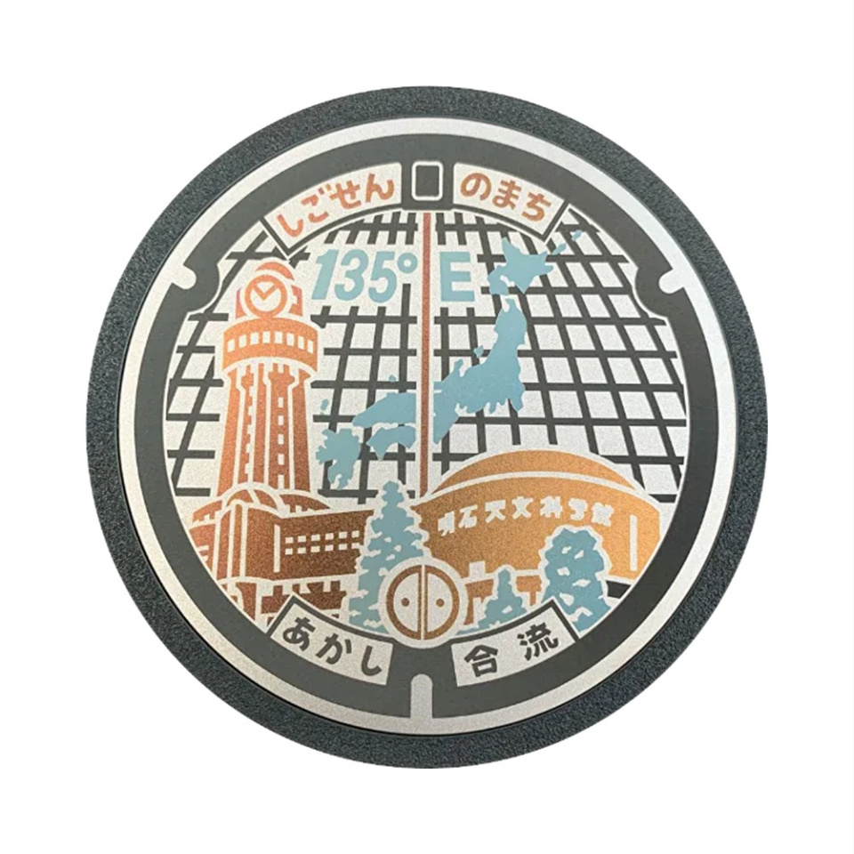 明石のシンボル・子午線と天文科学館を図案化したデザイン蓋は「子午線が北を向く」ように設置されています。天文科学館はこのデザイン蓋が作られた後に兵庫県南部地震(1995年)で被害を受けて改築されたため、昔の面影を伝える役割は路上の蓋に託されました。
