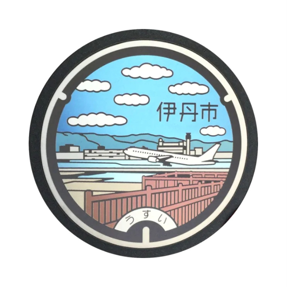 伊丹スカイパーク(大阪国際空港周辺緑地)から見た大阪国際(伊丹)空港の景色をデザインしたマンホールです。伊丹スカイパークは大阪国際(伊丹)空港の滑走路を離着陸する飛行機を間近に見ることができる観光スポットになっています。