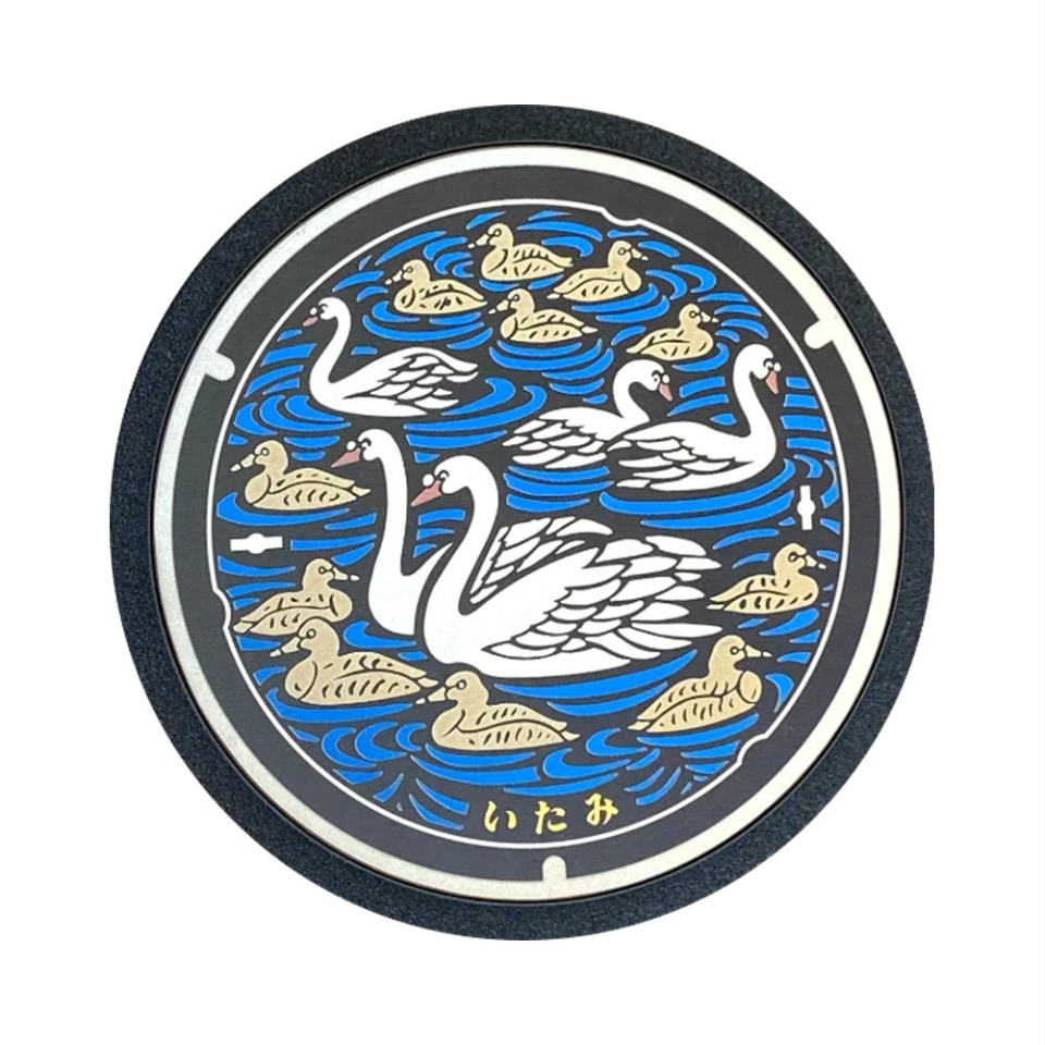 昆陽池公園の「白鳥」と市の鳥「カモ」が泳ぐ姿をデザインしたマンホールです。本マンホール蓋の製作に当たっては豊かな水環境を印象的に描くことにより伊丹市の快適な暮らしや循環型社会を支える下水道の貢献を表現しました。