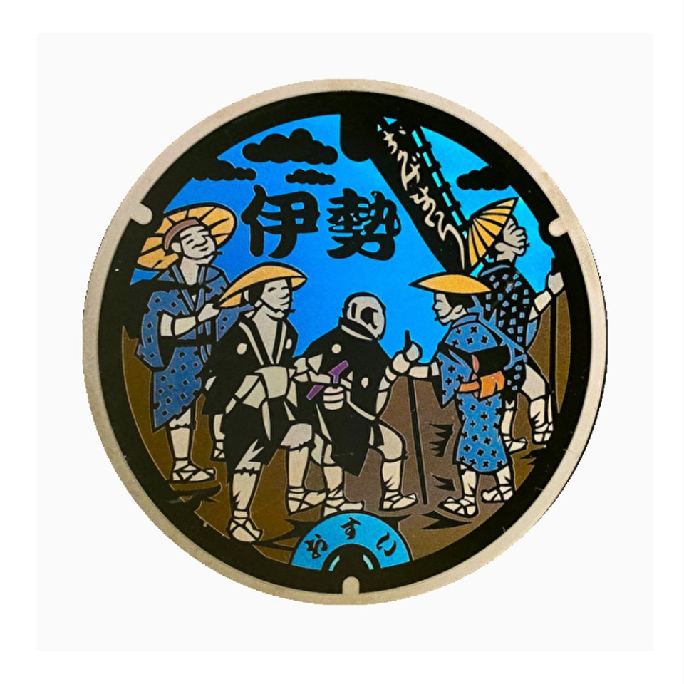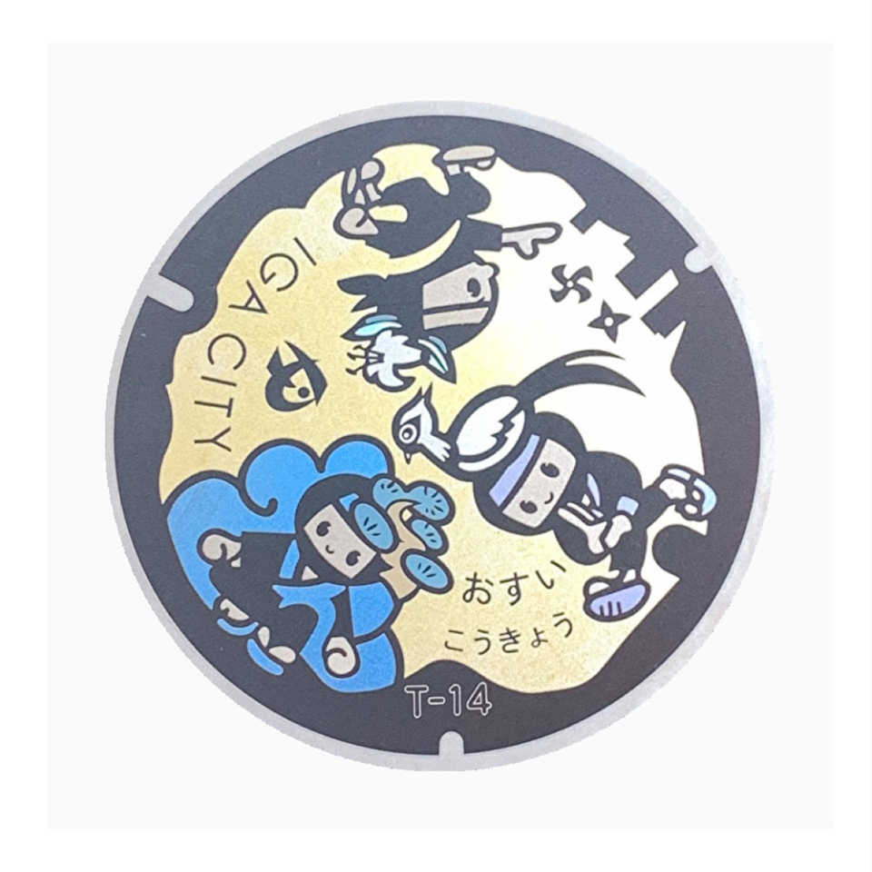 伊賀流忍者発祥の地である伊賀市。伊賀忍者は日本遺産に認定されています。伊賀忍者をさらに広くアピールするため、3人の伊賀忍者と市の花「ササユリ」、市の木「アカマツ」、市の鳥「キジ」をあしらったマンホール蓋です。