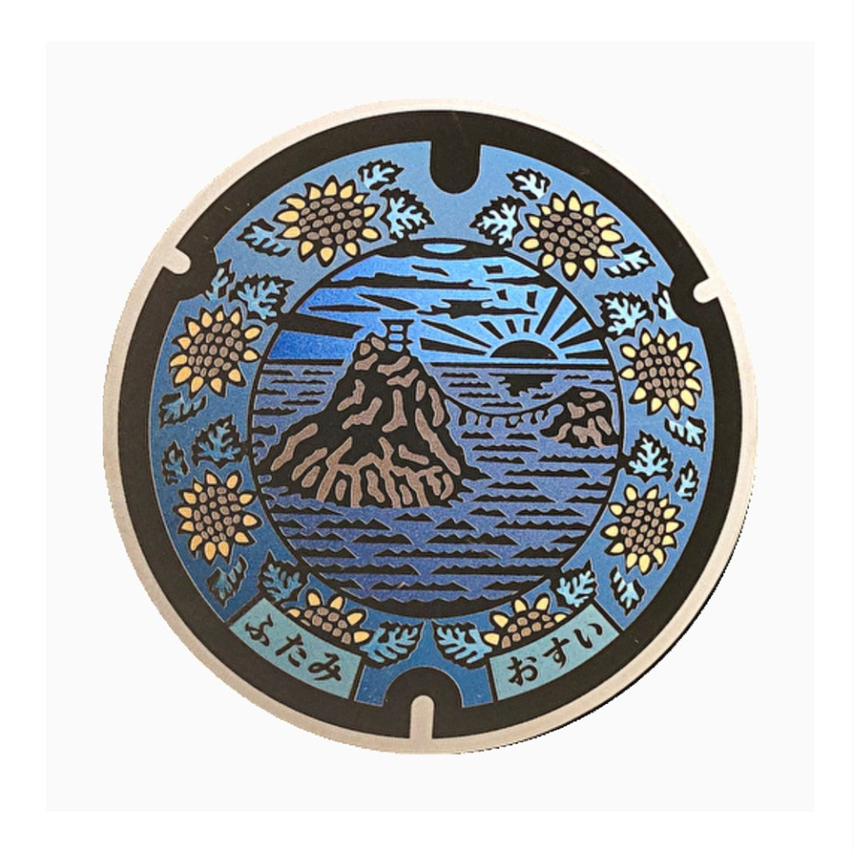 中央に描かれた二見興玉神社の「夫婦岩」は男岩と女岩が大注連縄で太く堅く結ばれているため縁結びのシンボルとして有名です。夫婦岩の間からは10月から1月の満月の頃に月の出も拝むことができます。周囲に配された向日葵は旧二見町の花です。