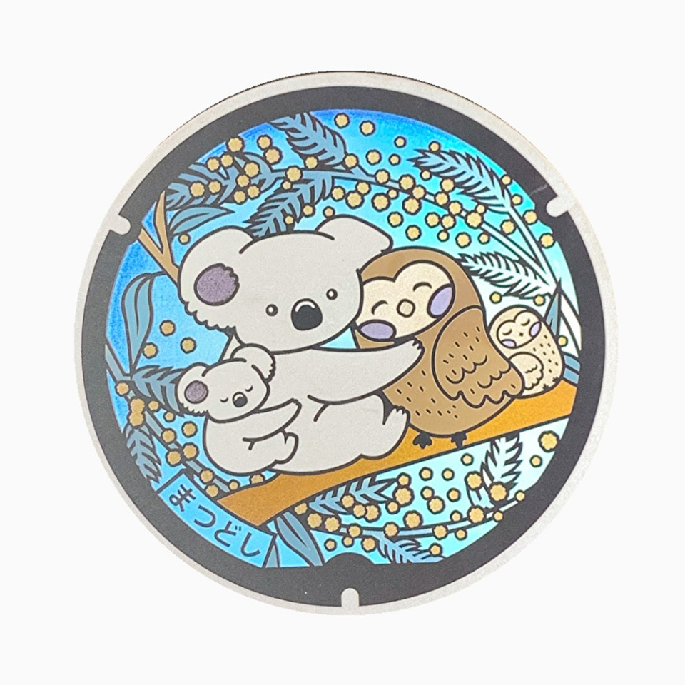 オーストラリア固有種のコアラと松戸市の鳥・ふくろうの親子が寄り添っている姿に、「親の世代も子供の世代もずっとずっと姉妹都市交流が続くように」という願いが込められています。背景には「友情」が花言葉のミモザが描かれています。