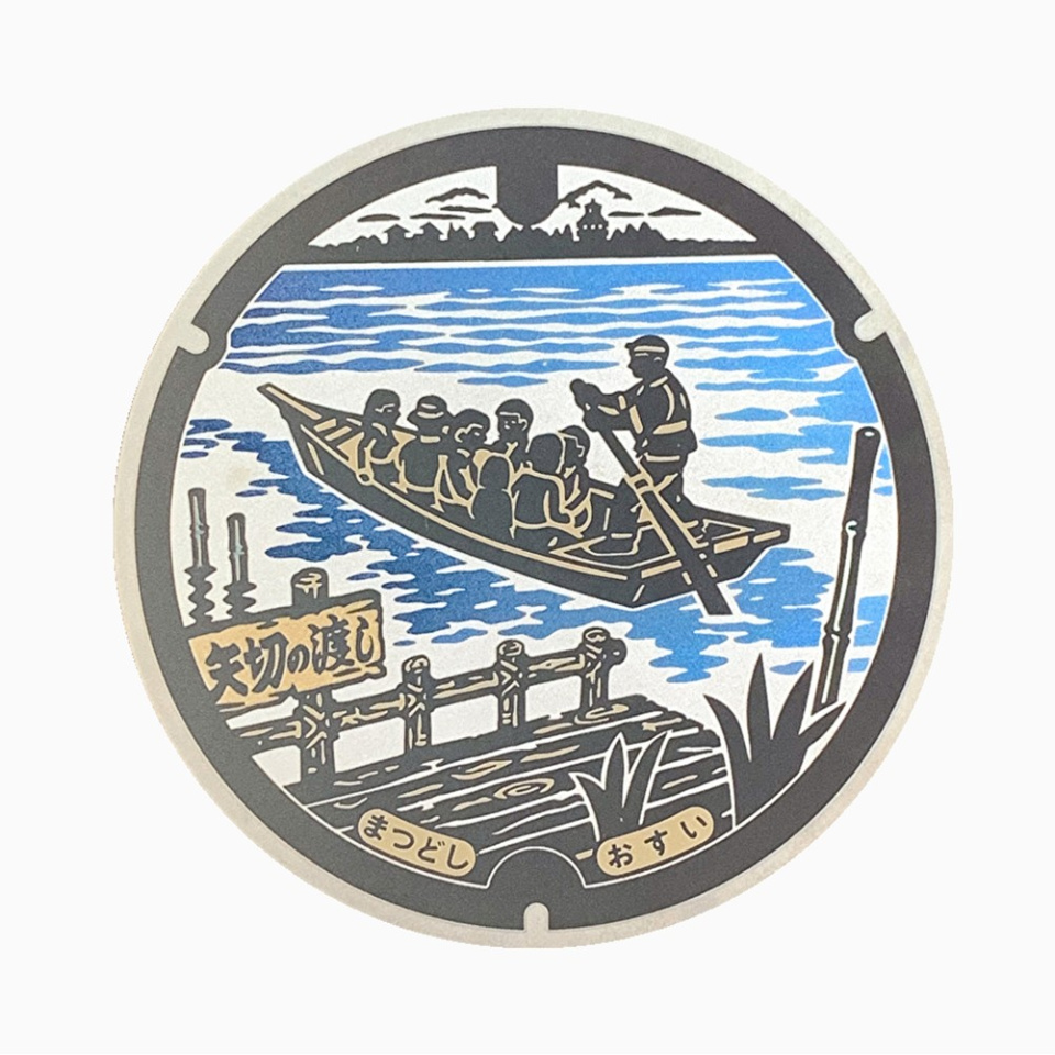 「江戸川と矢切の渡し」の風景をデザインしたものです。松戸市は千葉県北西部に位置し、江戸川で唯一の渡し船が矢切の渡しとなっています。江戸時代初期の徳川幕府によってはじめられてから、約400年後の今も続いています。