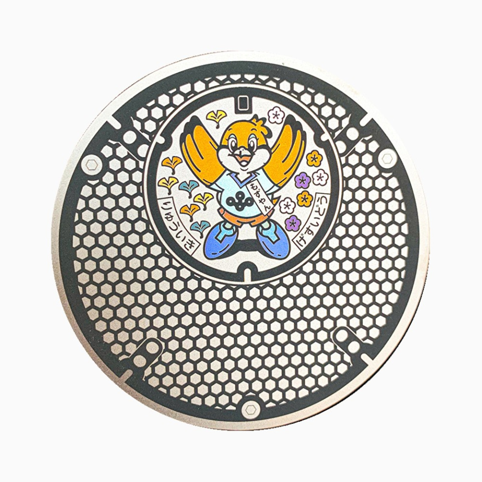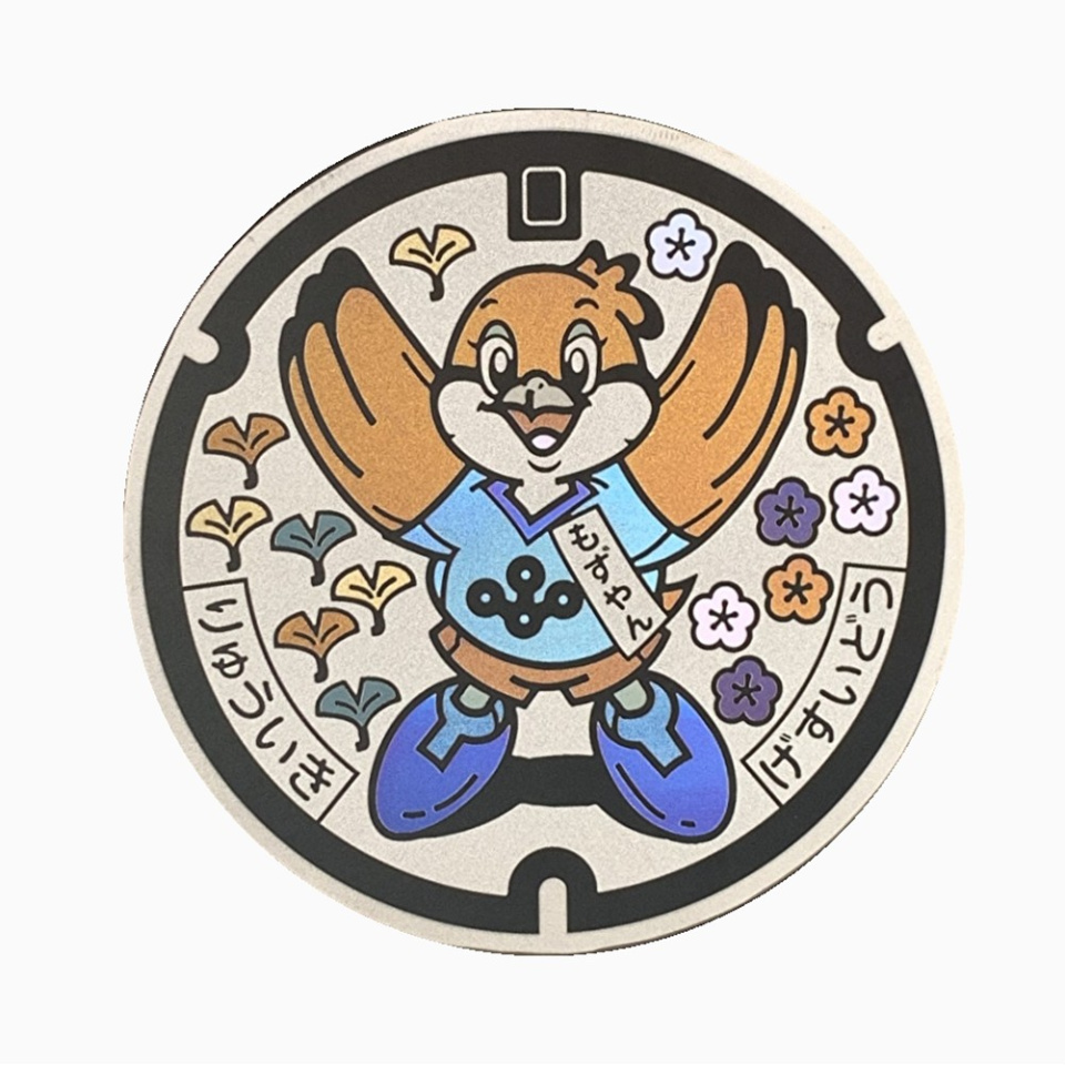 大阪府広報担当副知事「もずやん」とコラボしたマンホールふたのデザインを一般公募により決定し、2016年1月にデザインを発表。「もずやん」を中央に配置し、その周りに府の花・ウメの木・イチョウをデザインしたものです。