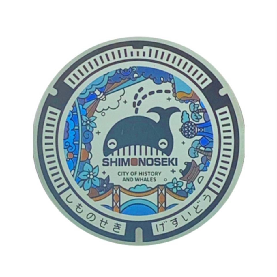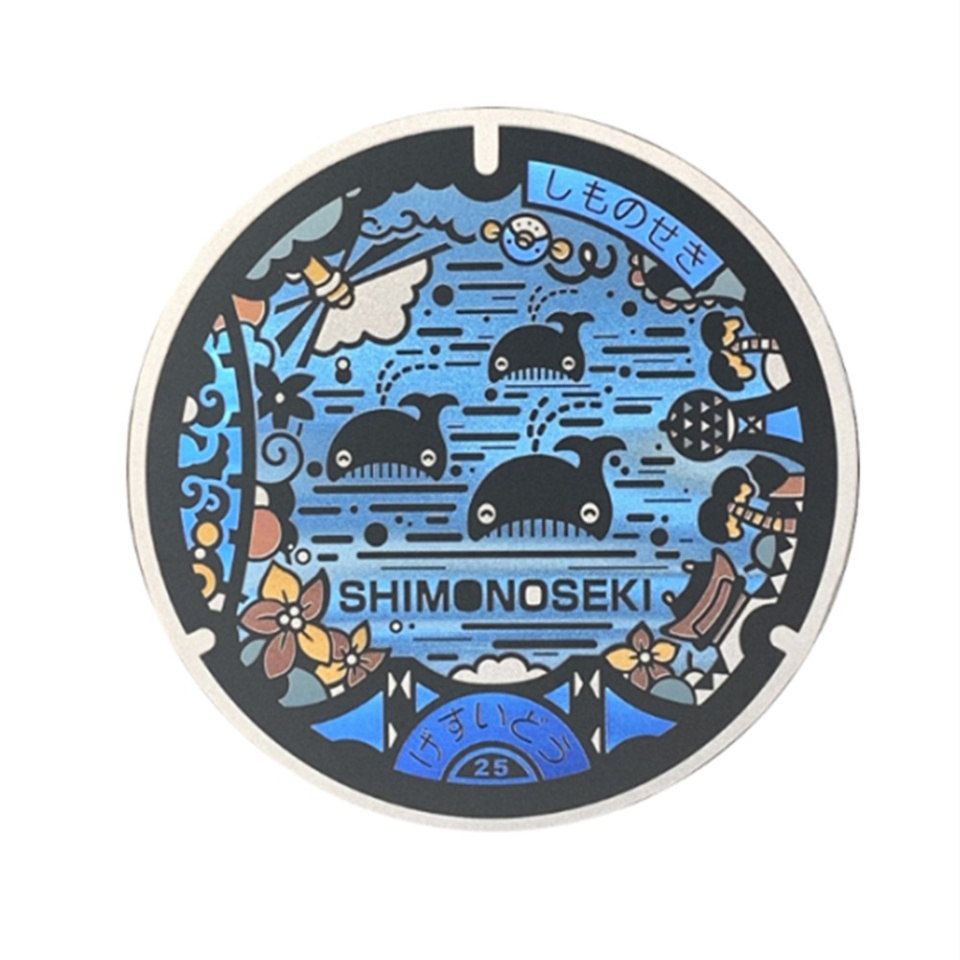 下関市の水産物5大ブランドの1つである「ふぐ」は、幸福の「福」にかけて「ふく」と呼びます。このマンホールは、下関市のシンボルマークとなっている「ふく」を親しみやすく愛らしく表現し、下関の頭文字「し」を造形化した「波」の中から現れる様子を表しています。