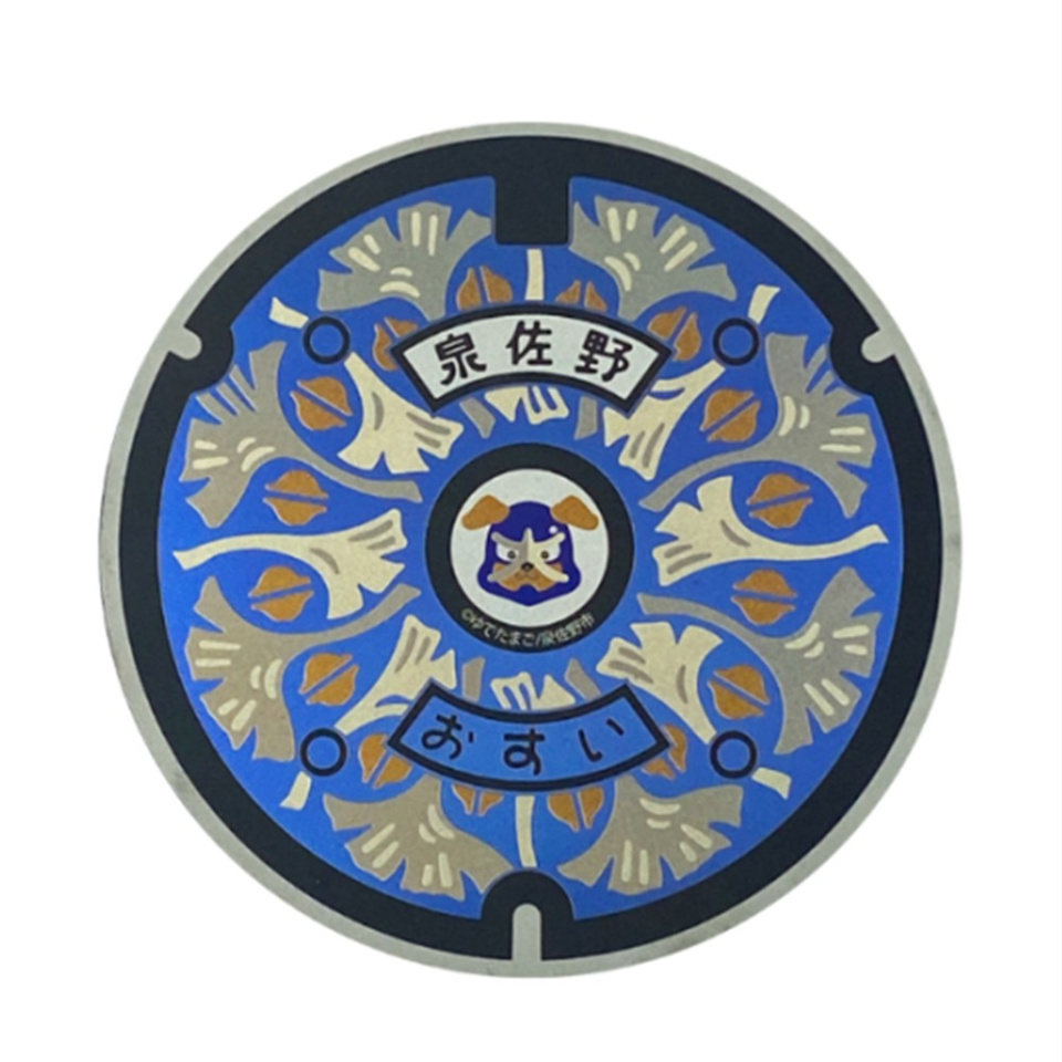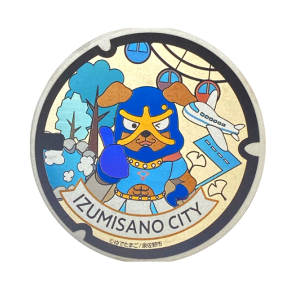 蓋の中央でいいねサインを出しているのは泉佐野市の公式キャラクター「一生犬鳴!イヌナキン!」の分身「ゆるナキン」です。その周囲には関西国際空港や渓谷沿いの豊かな自然に抱かれた犬鳴山温泉、りんくうタウンのシンボルとなっている観覧車が配されています。