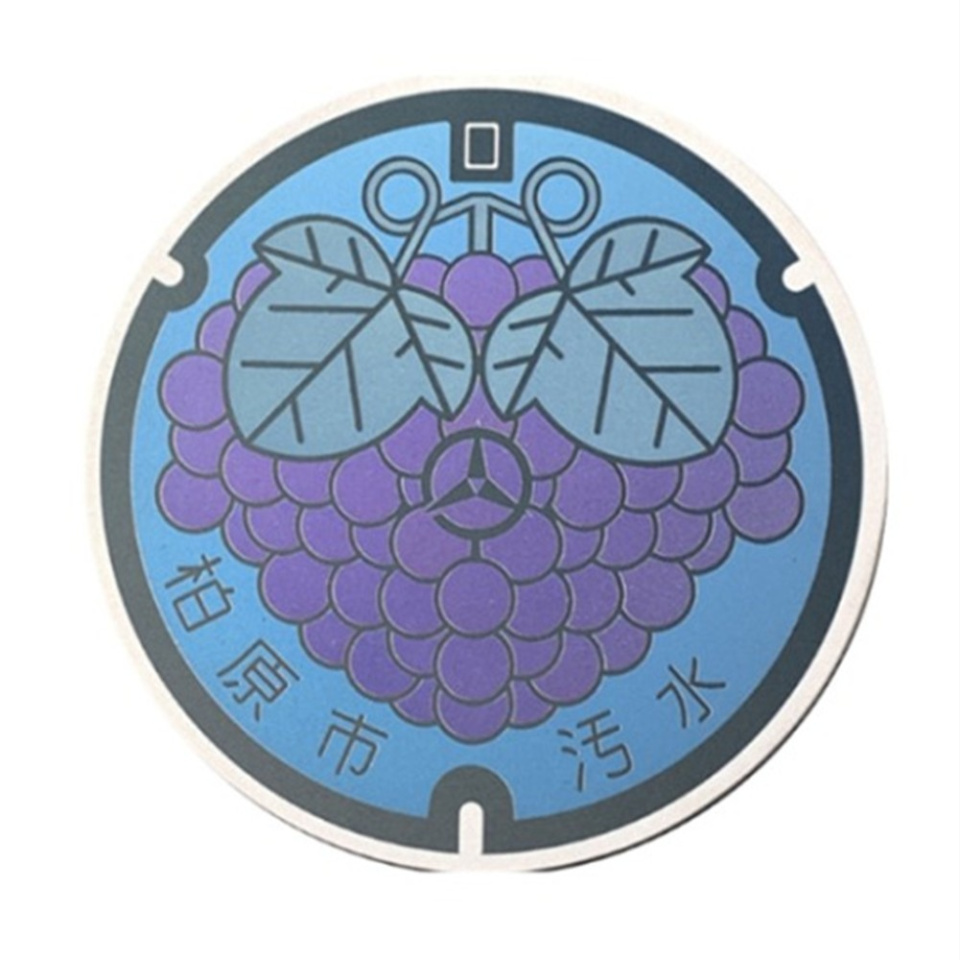 市の特産品である柏原のデラウエアをマンホール蓋いっぱいに描き、中央には大和川と石川の合流点に位置する市の発展と親和を象徴した市章を据え、1990年に開催された「国際花と緑の博覧会」にあわせて市の職員が図案化しました。