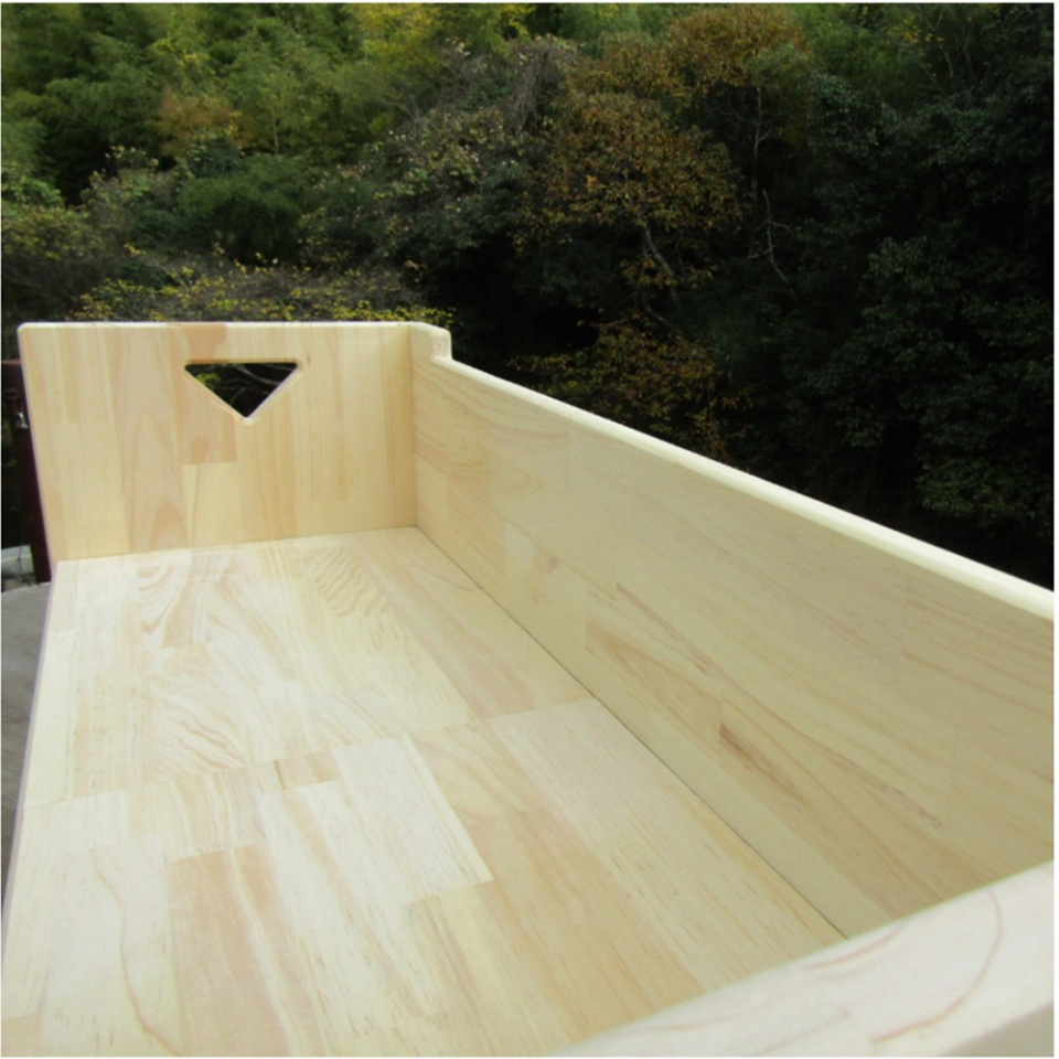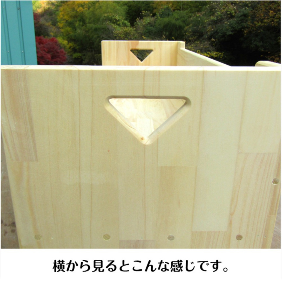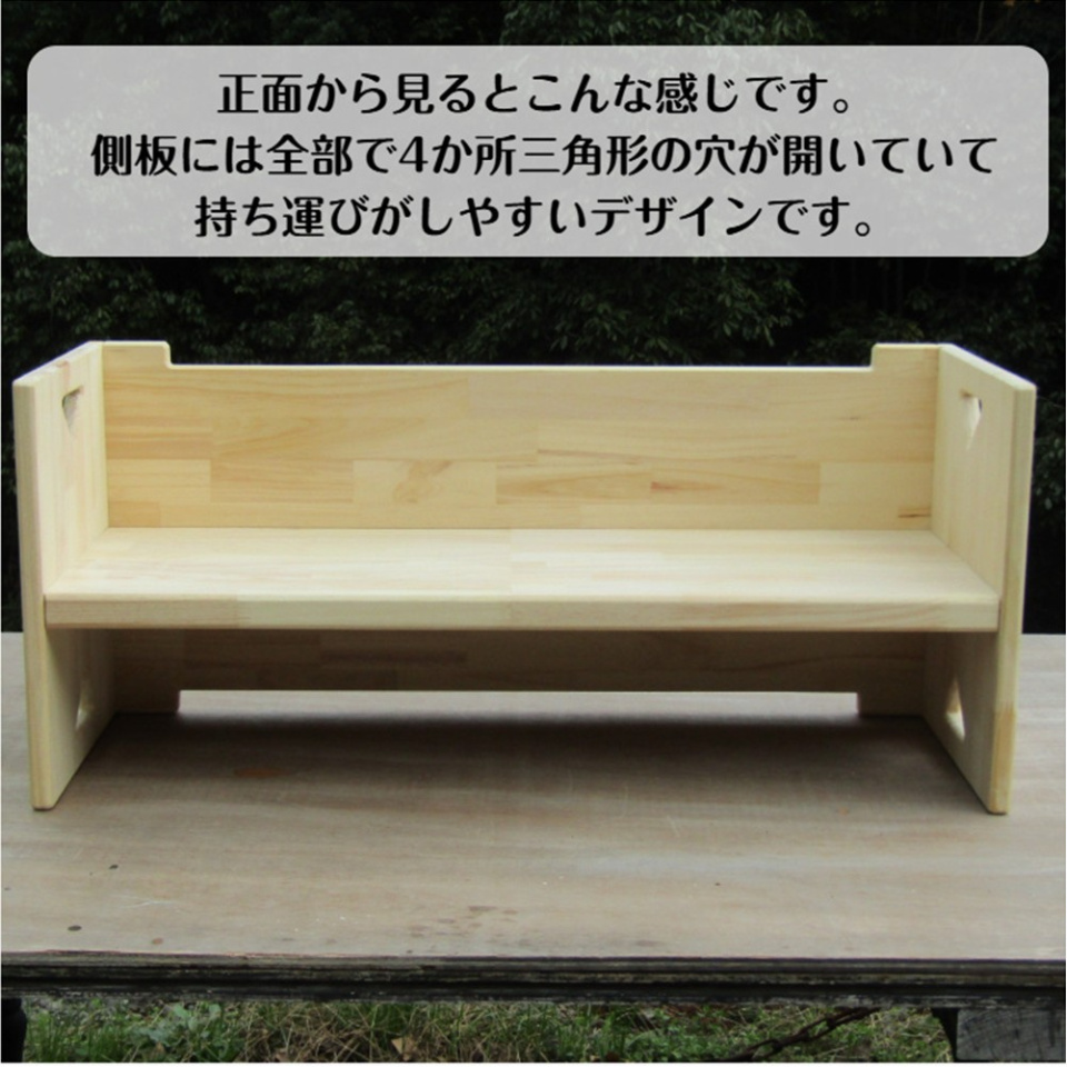 側板に手を差し入れる三角の穴が4か所開いているので、大人2人で持っていただくと移動も簡単、ひっくり返すのも簡単にしていただけます。余計な飾りをつけず、シンプルなデザインなので、埃がたまりにくく、掃除もしやすくなっています。