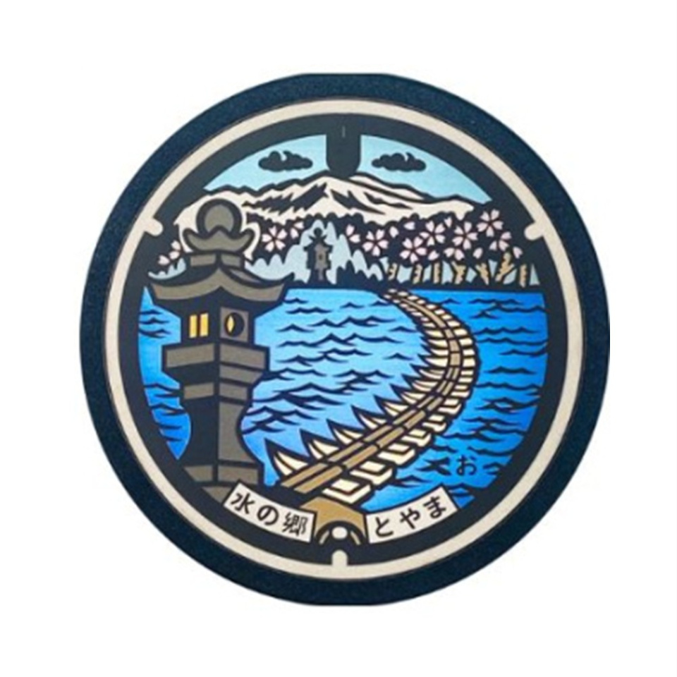 江戸時代に旧神通川(現在の松川)に架けられていた船橋と常夜灯をデザインしたマンホール蓋です。