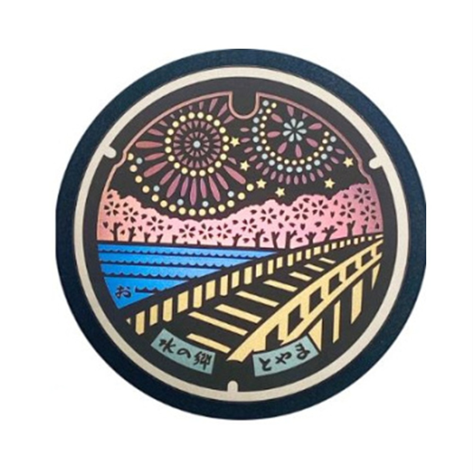 市内東部にある水橋地区の中心を流れる白岩川とそこに架かる東西橋、「水橋橋まつり」の花火がデザインされているマンホール蓋です。白岩川に初めて橋が架かったことを記念して始まった「水橋橋まつり」では盛大な花火が打ちあがり、春には河岸に桜が咲き誇り隠れた名所となっています。