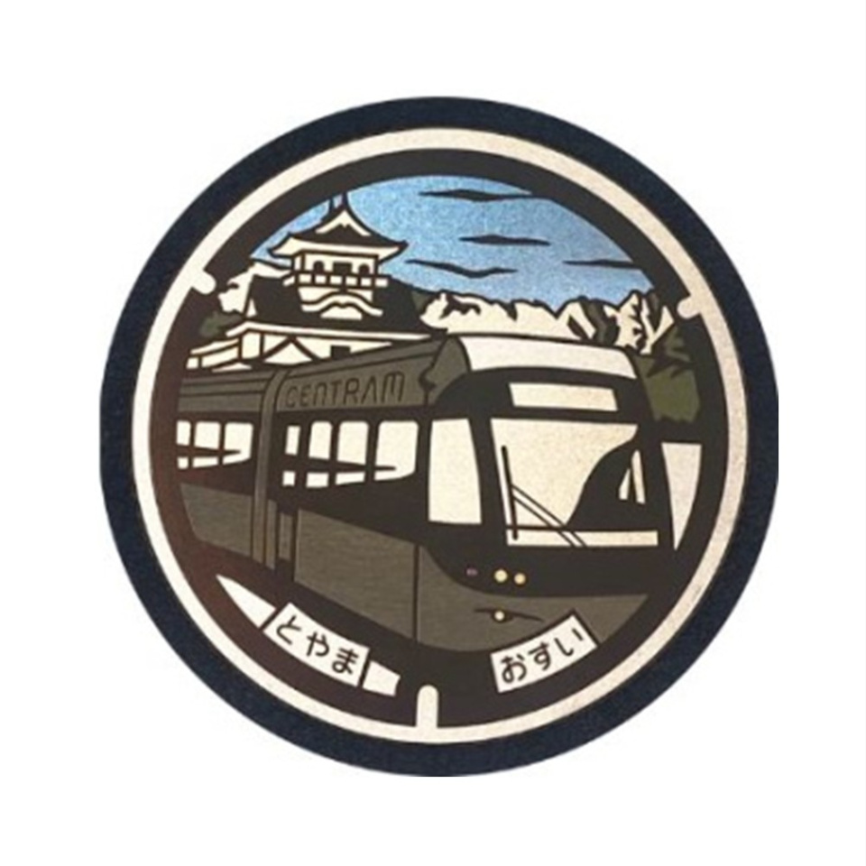 まちのシンボル富山城と路面電車をテーマとしたマンホール蓋です。3000m級の山々が連なる立山連峰と国の有形文化財である富山城を背景にして近代的な路面電車が走る姿が大きく描かれ歴史と空間を越えた共演が実現しています。