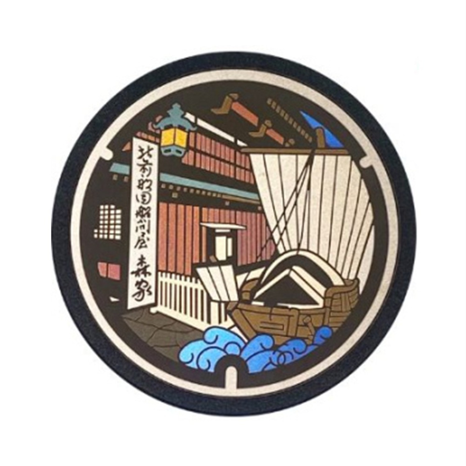 かつて日本海交易において活躍した「北前船」その北前船と日本海の荒波、さらには北前船の寄港地である岩瀬地区の廻船問屋「森家」を表現したマンホール蓋です。明治11年頃に建てられた「森家」は平成6年にその歴史的価値が認められて国の重要文化財に指定されました。