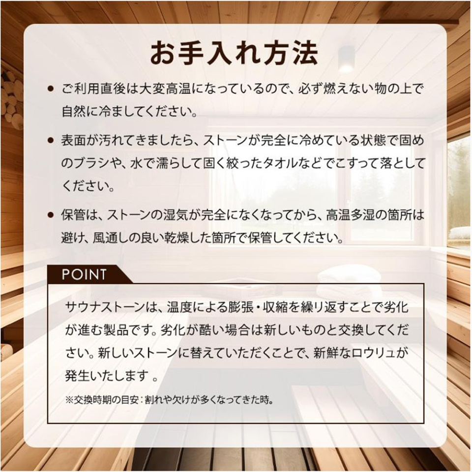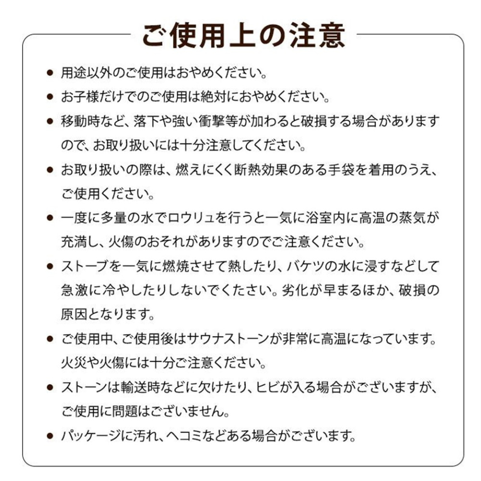 ④サウナストーンが十分過熱しましたら、始めにごく少量の水をサウナストーンにかけてください。蒸気が発生する様子で石が熱せられていることを確認してから、本格的にロウリュを行ってください。