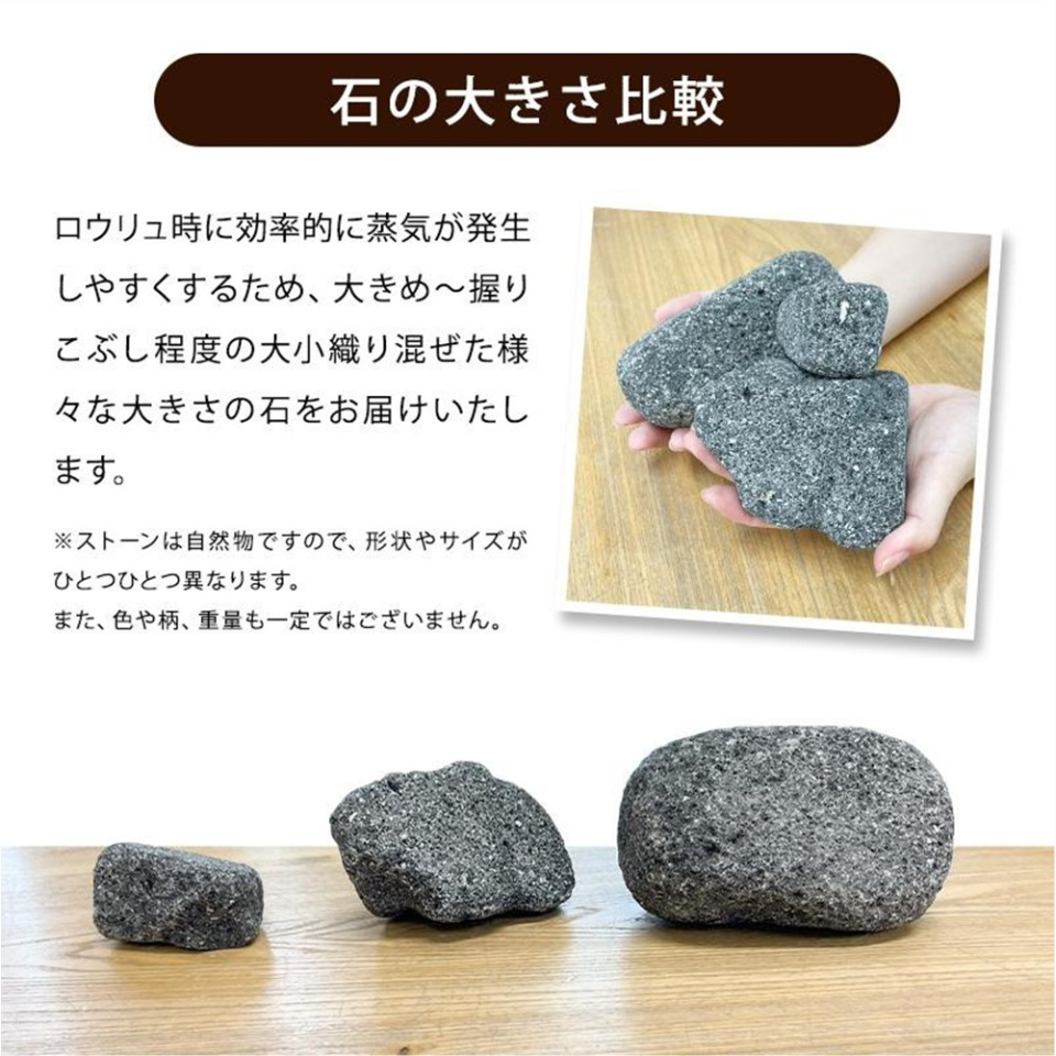 ロウリュ時、効率的に蒸気を発生しやすくするため、大きめ~握りこぶし程度の大小織り混ぜた様々な大きさの石をお届けいたします。