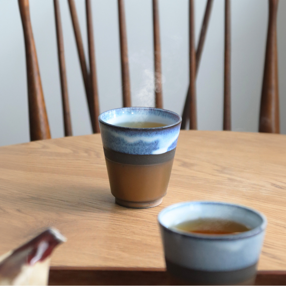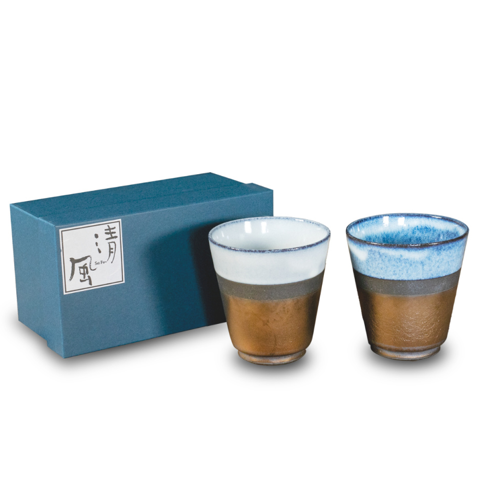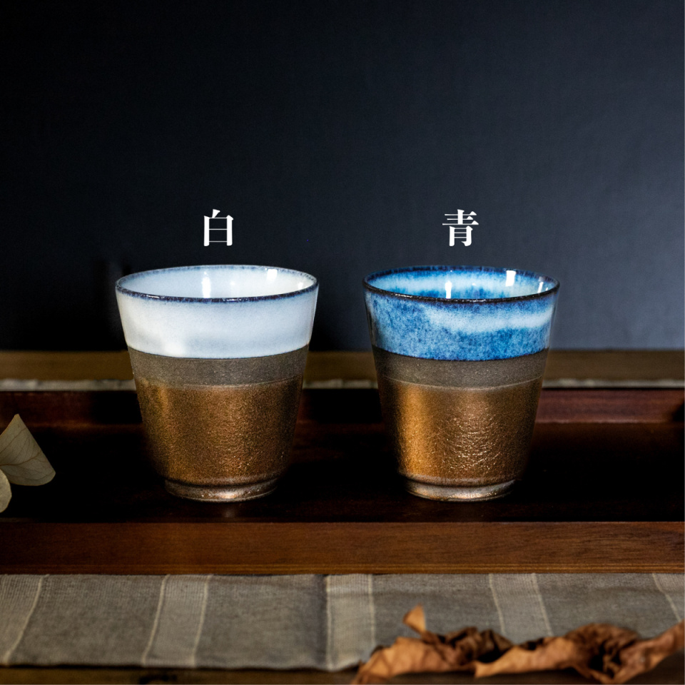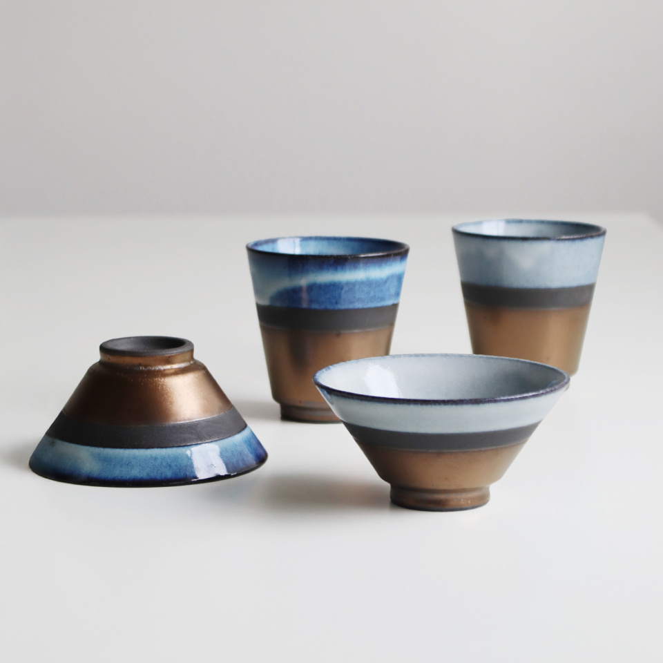 つやっとした白、青の釉薬の生地とゴールドのマットな質感が楽しめます。