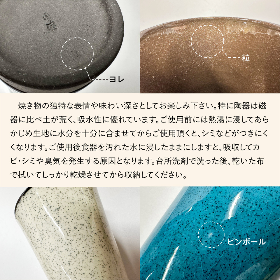 ・焼き物の性質上、鉄粉、色ムラ、釉垂れ、ピンホール、小キズ、多少のゆがみが発生する場合がございますが、 不良品ではございません。またご使用上の問題はございませんので、ご安心ください。