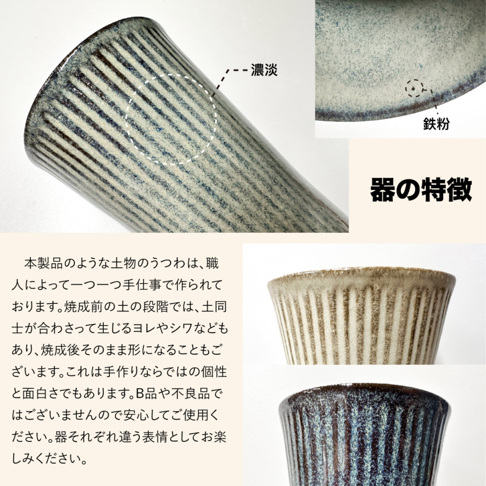 ・焼き物の性質上、鉄粉、色ムラ、釉垂れ、ピンホール、小キズ、多少のゆがみが発生する場合がございますが、 不良品ではございません。またご使用上の問題はございませんので、ご安心ください。