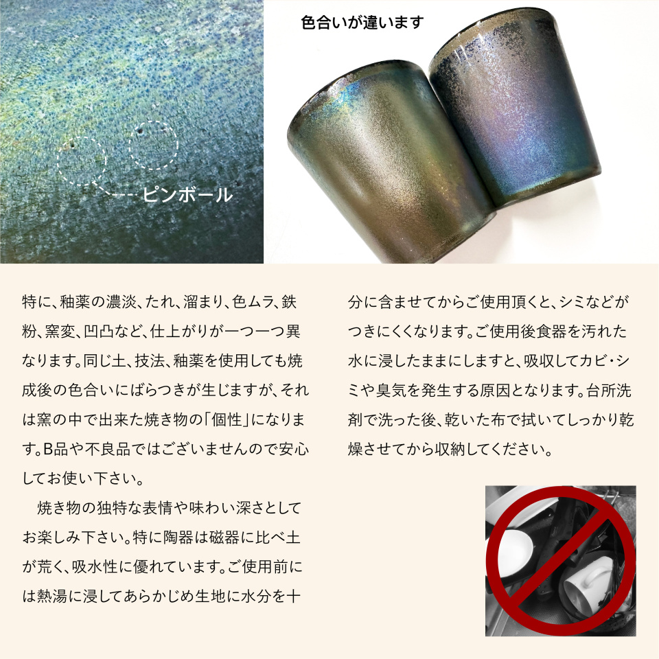 ・焼き物の性質上、鉄粉、色ムラ、釉垂れ、ピンホール、小キズ、多少のゆがみが発生する場合がございますが、 不良品ではございません。またご使用上の問題はございませんので、ご安心ください。