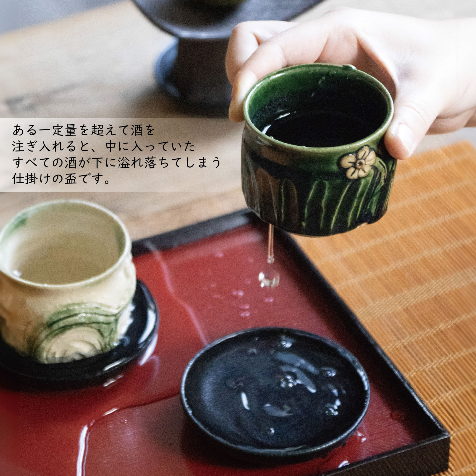 盃は特殊な構造で、酒やお水をカップの半分以上注ぐと下からこぼれ、あっという間にカップの中は空っぽに。
