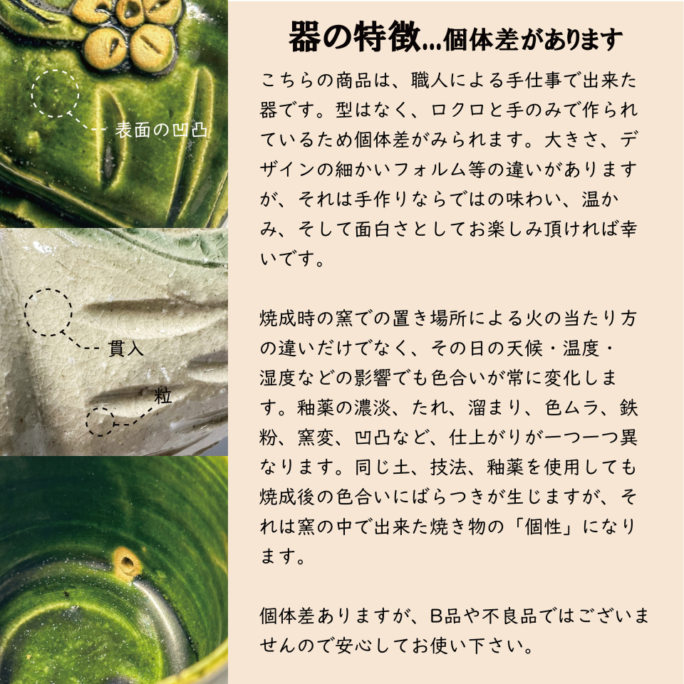 ・焼き物の性質上、鉄粉、色ムラ、釉垂れ、ピンホール、小キズ、多少のゆがみが発生する場合がございますが、 不良品ではございません。またご使用上の問題はございませんので、ご安心ください。