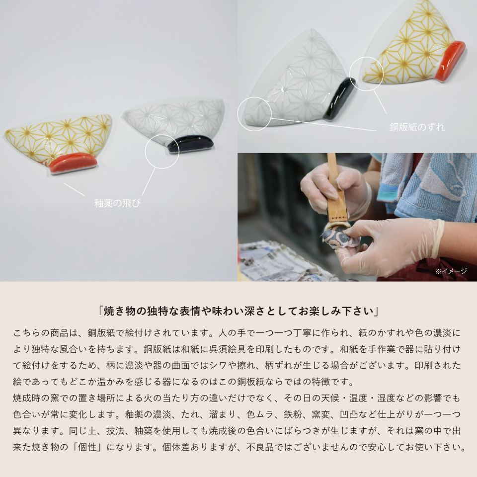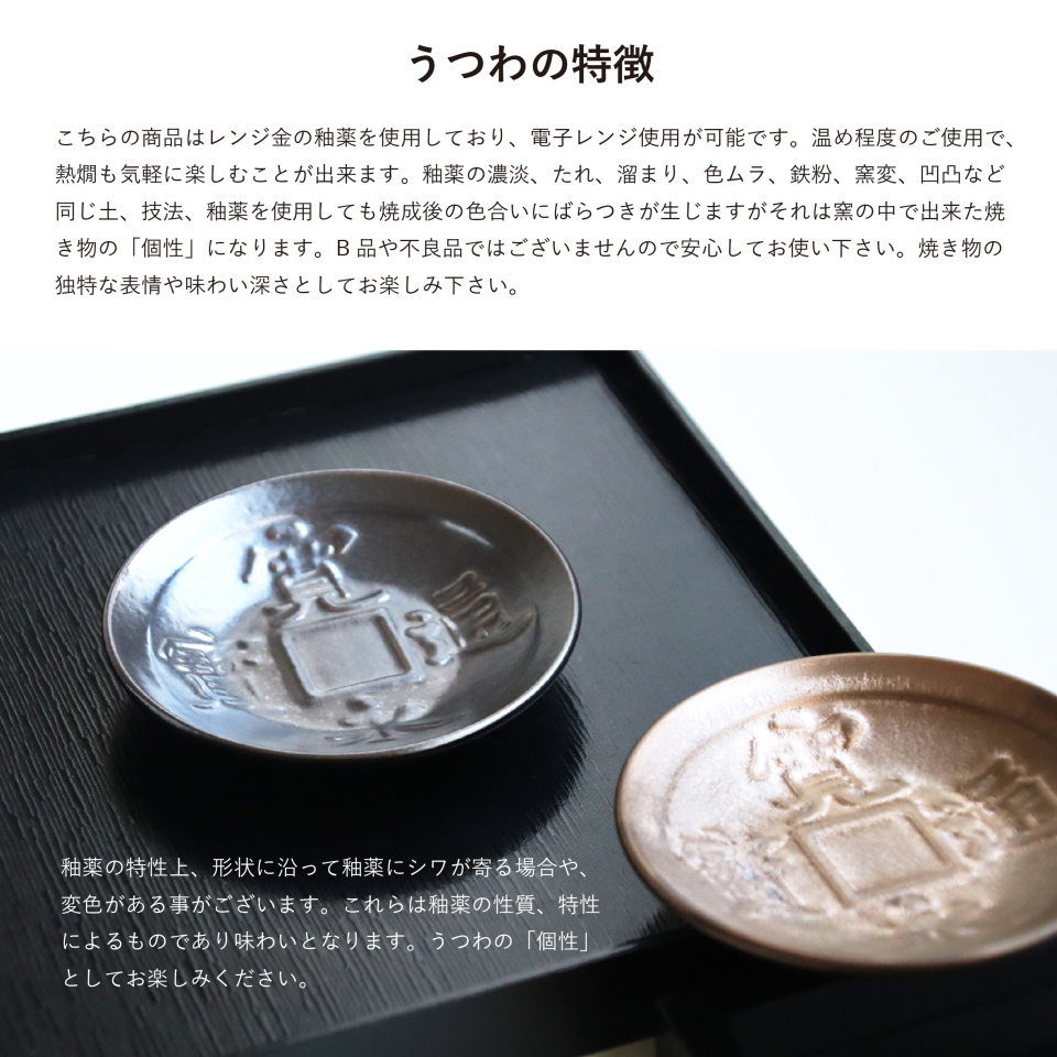 ・焼き物の性質上、鉄粉、色ムラ、釉垂れ、ピンホール、小キズ、多少のゆがみが発生する場合がございますが、 不良品ではございません。またご使用上の問題はございませんので、ご安心ください。