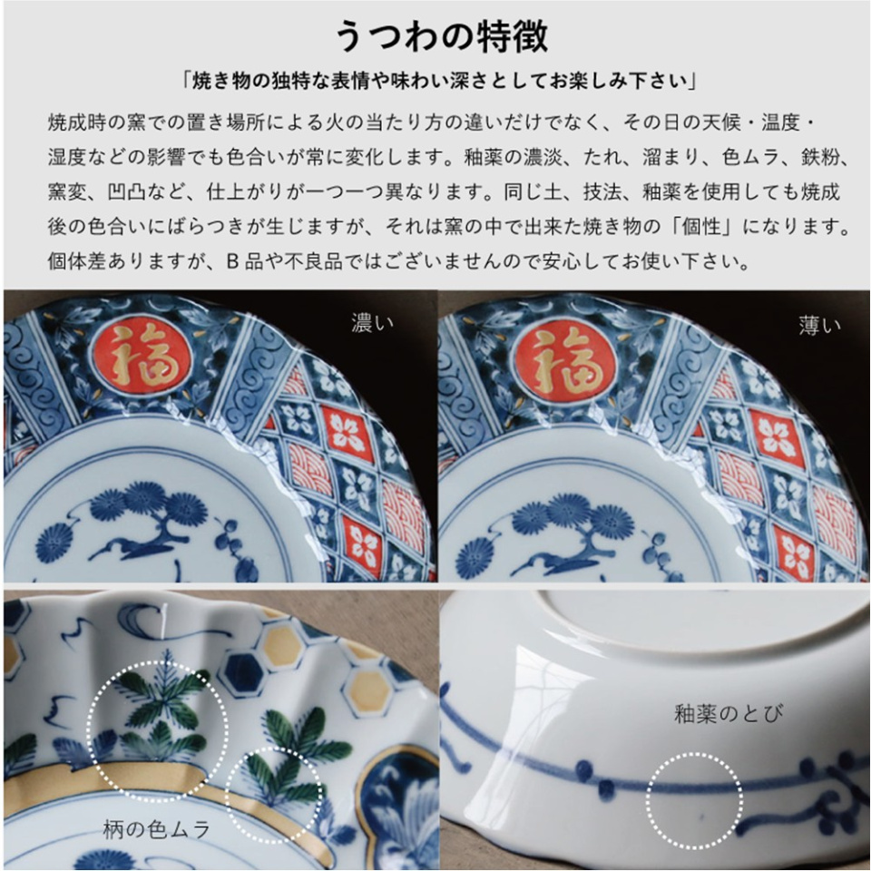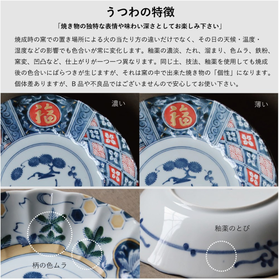 ・焼き物の性質上、鉄粉、色ムラ、釉垂れ、ピンホール、小キズ、多少のゆがみが発生する場合がございますが、 不良品ではございません。またご使用上の問題はございませんので、ご安心ください。