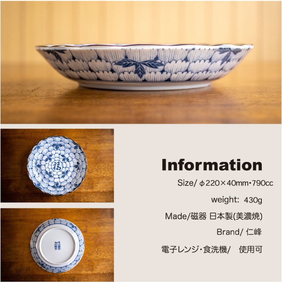お皿の中心には「福」の文字が施されて縁起にも良い、使った人誰しもが幸福をもたらす器になります。