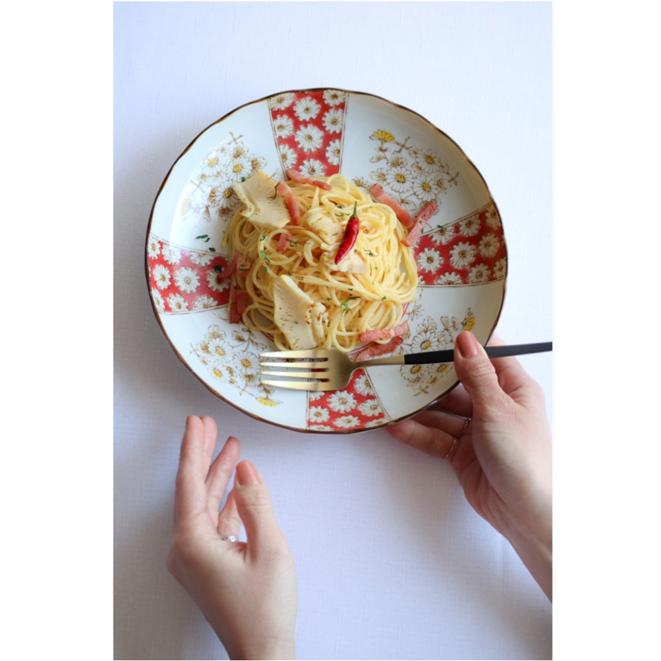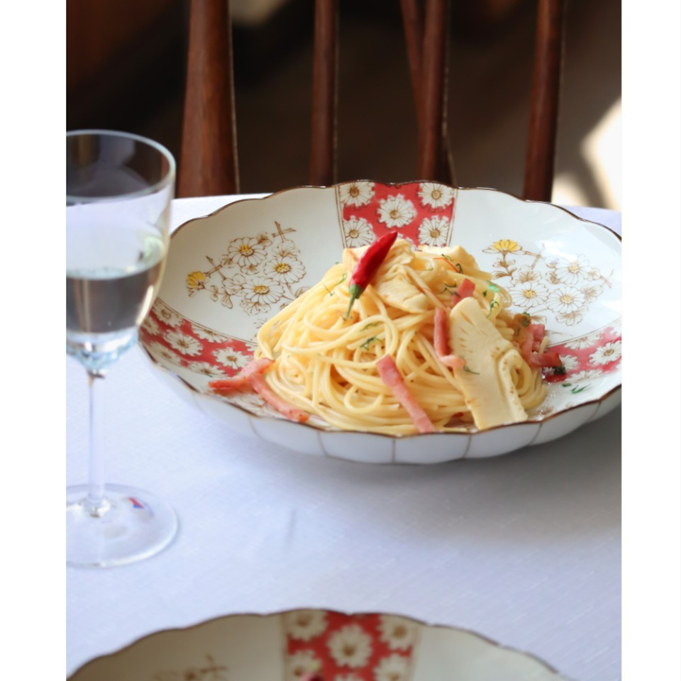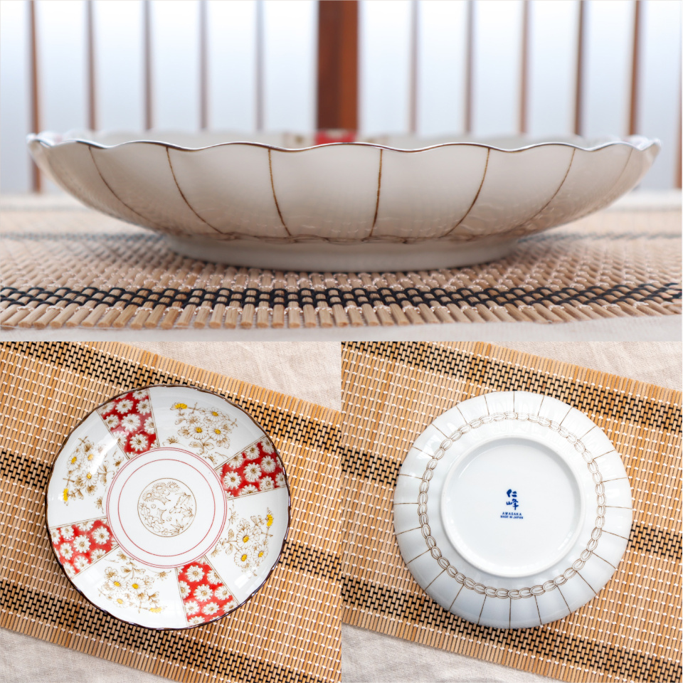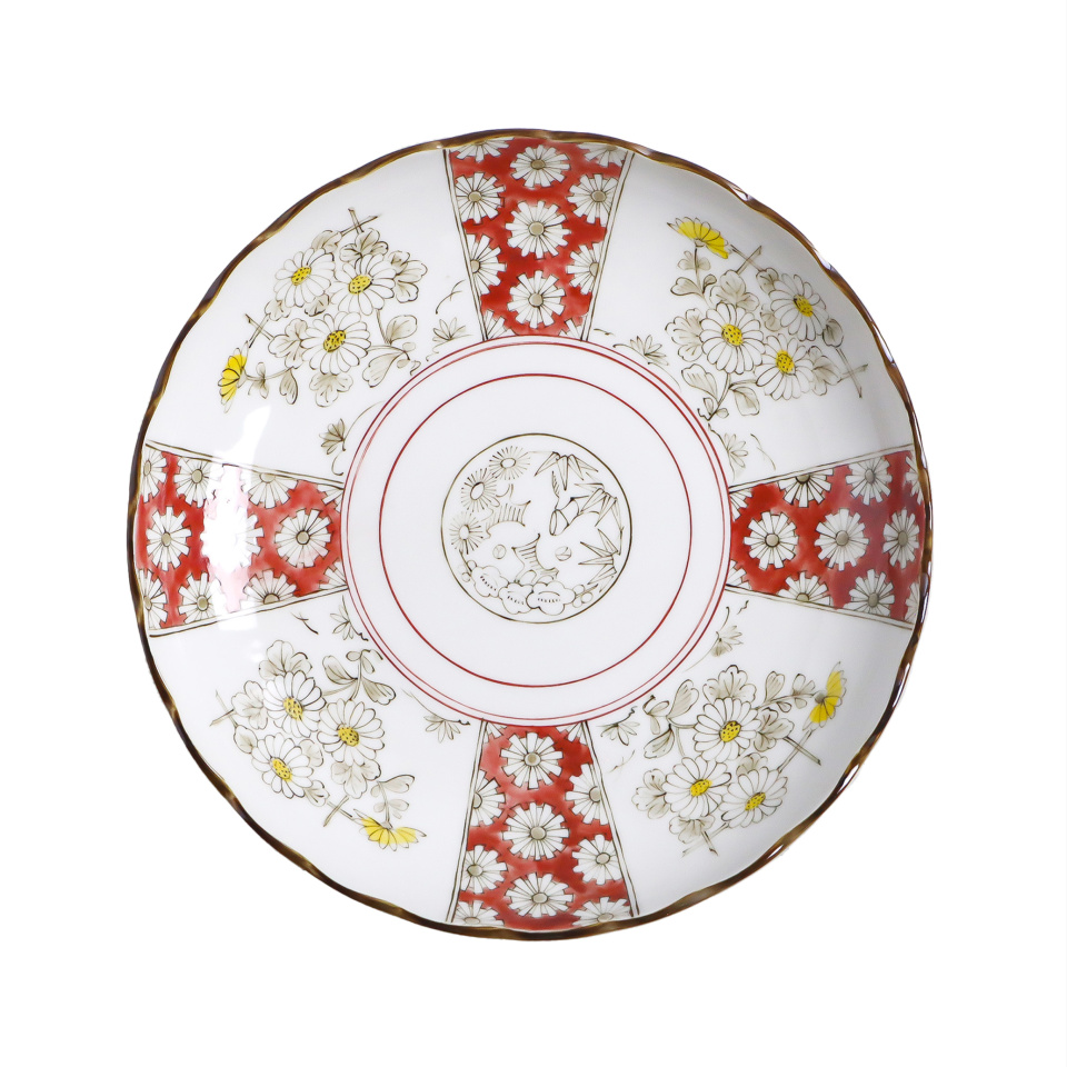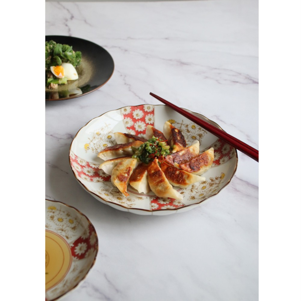 菊型のお皿に繊細なタッチと可愛らしい色合いで菊が描かれ、様々な料理に合わせていただけます。