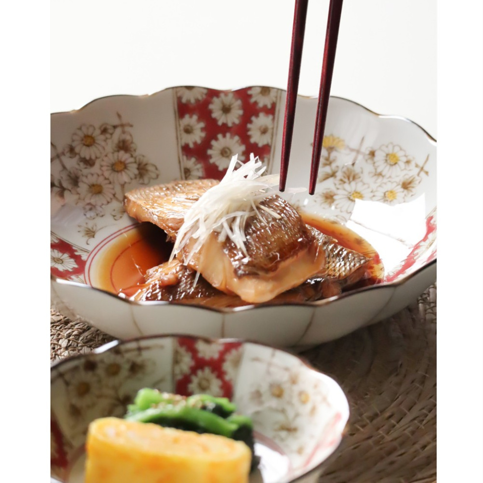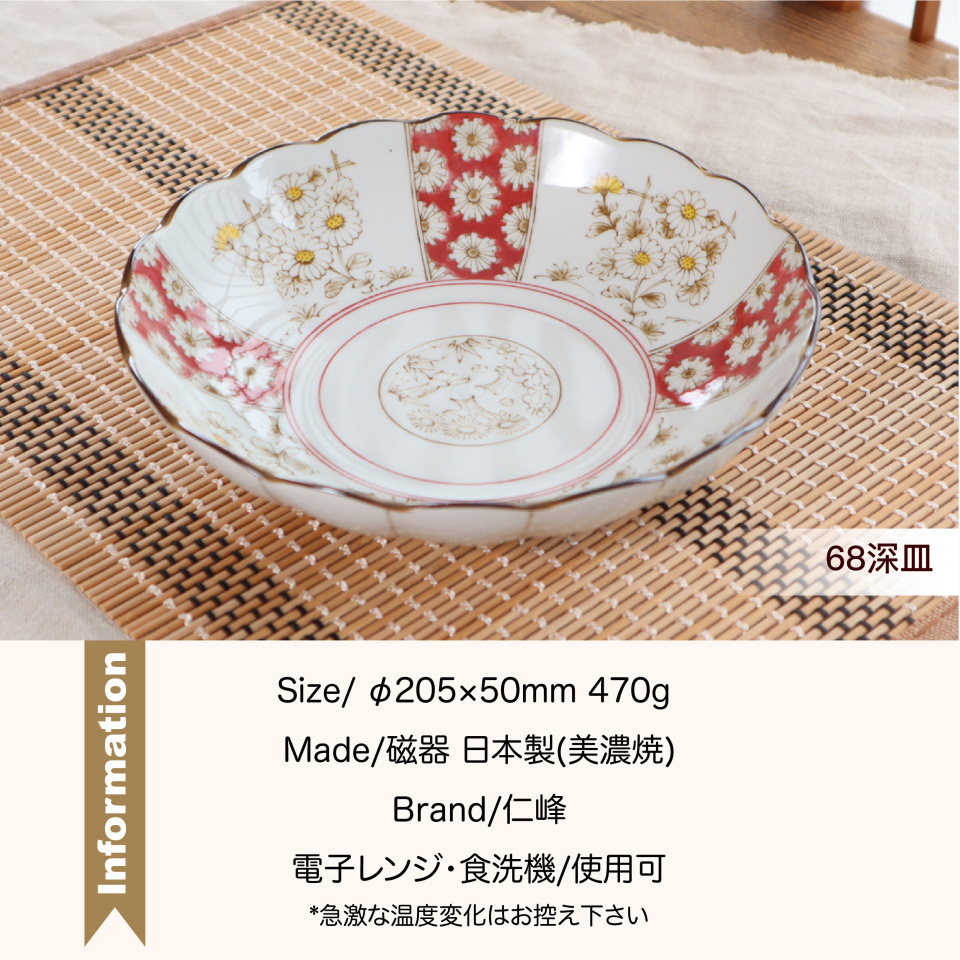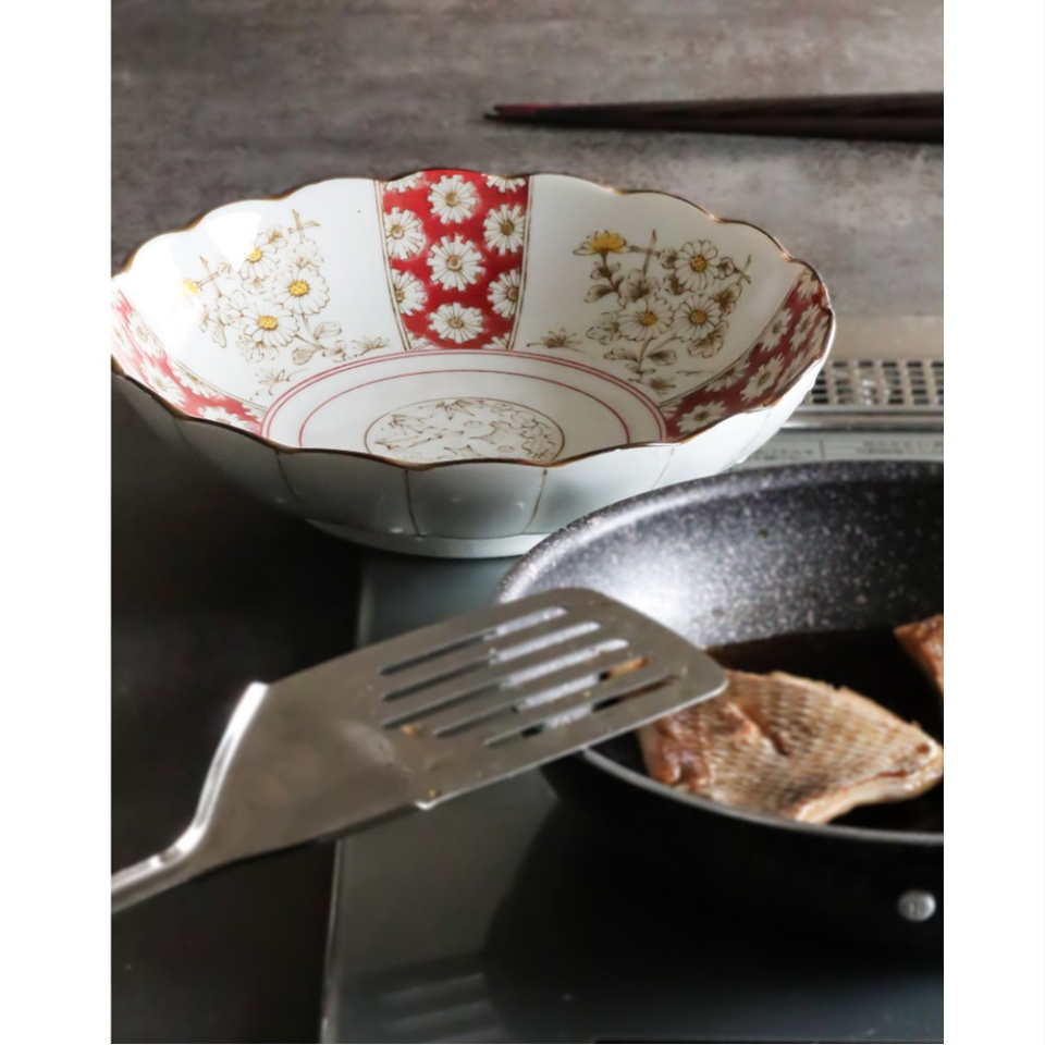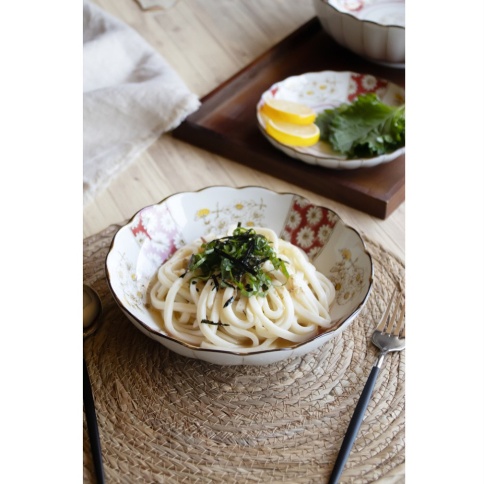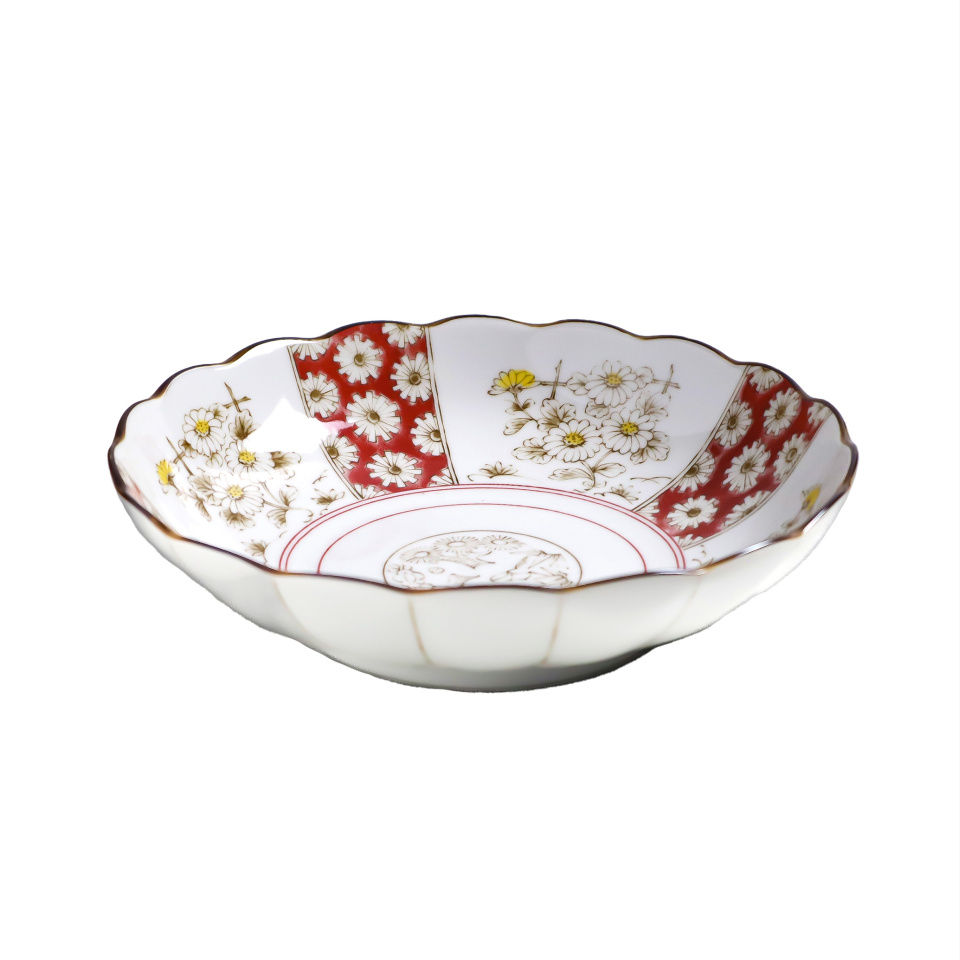 菊型のお皿に繊細なタッチと可愛らしい色合いで菊が描かれ、様々な料理に合わせていただけます。