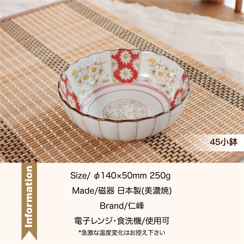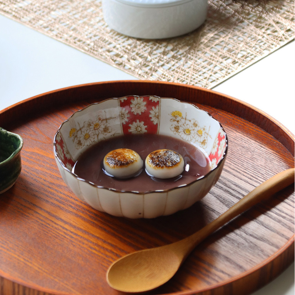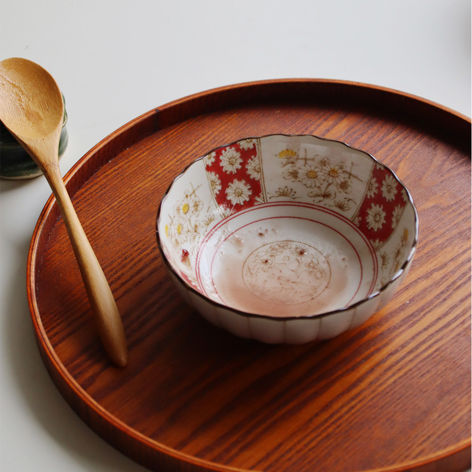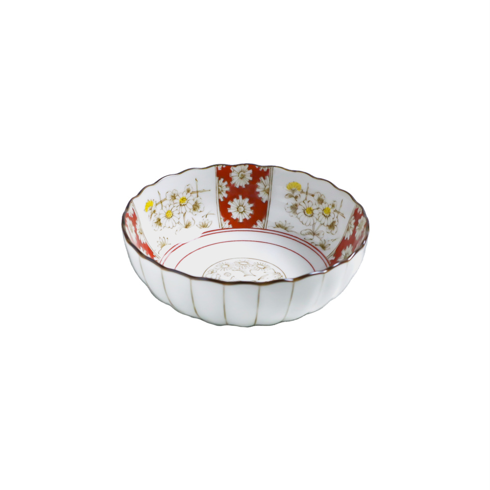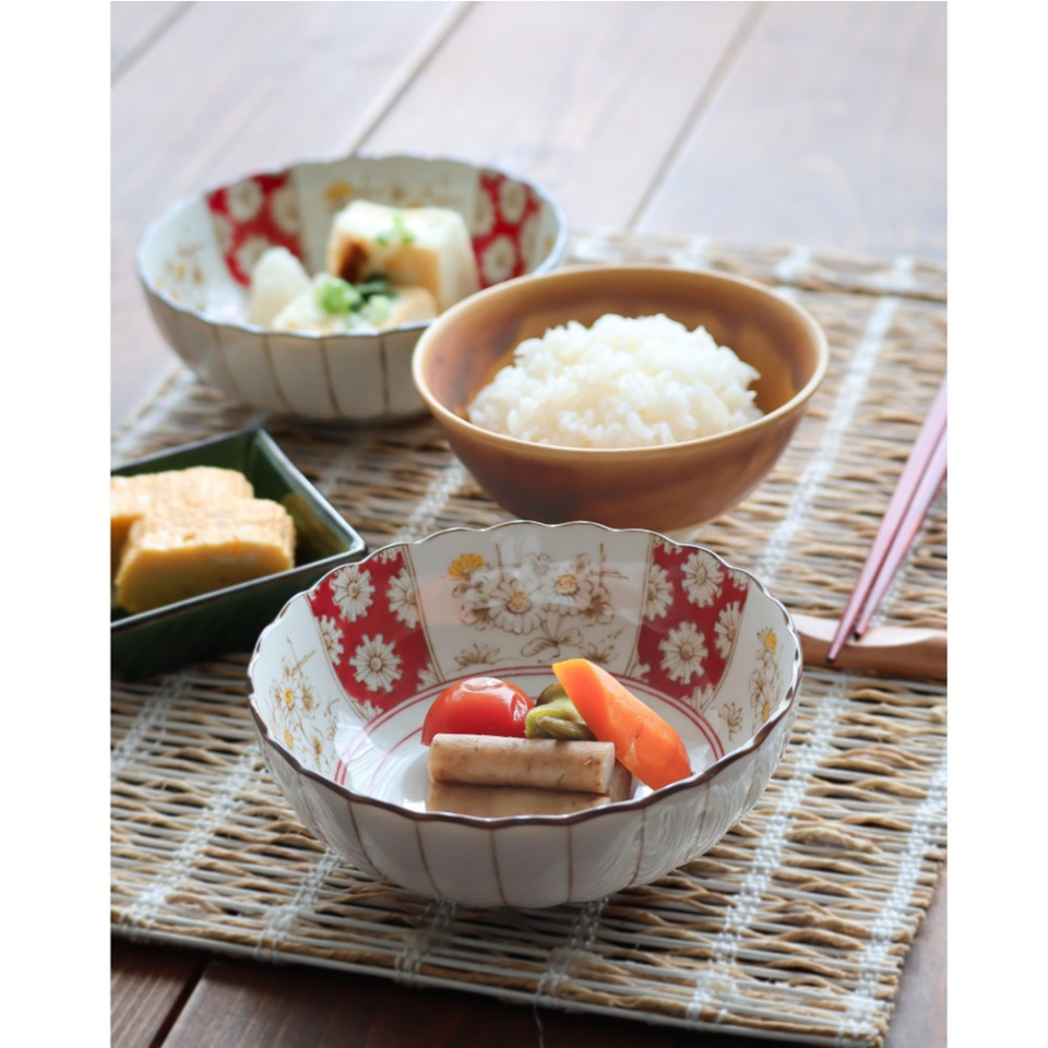 菊型のお皿に繊細なタッチと可愛らしい色合いで菊が描かれ、様々な料理に合わせていただけます。