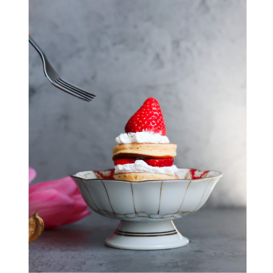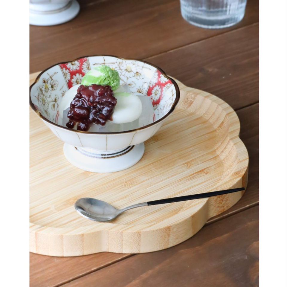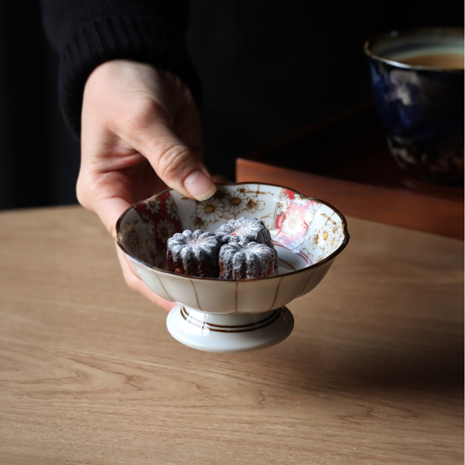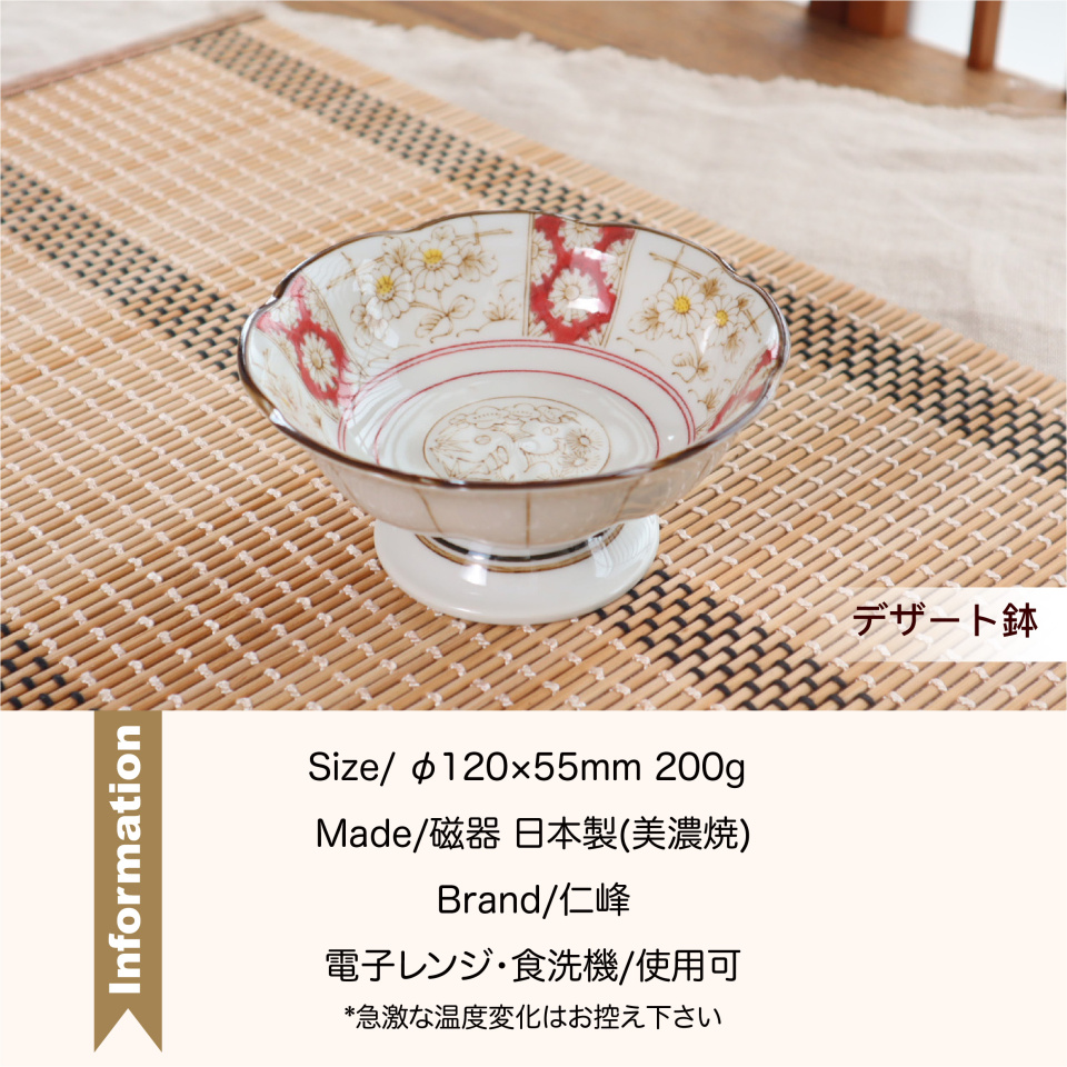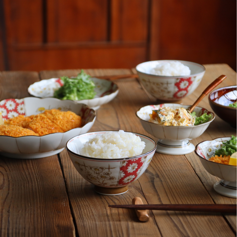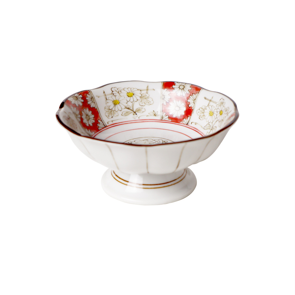 菊型のお皿に繊細なタッチと可愛らしい色合いで菊が描かれ、様々な料理に合わせていただけます。