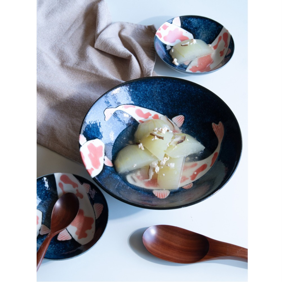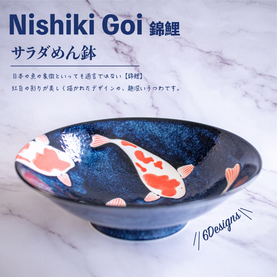 撥水の技法を用いて、錦鯉の赤と白の美しさがより際立つようにデザインしています。