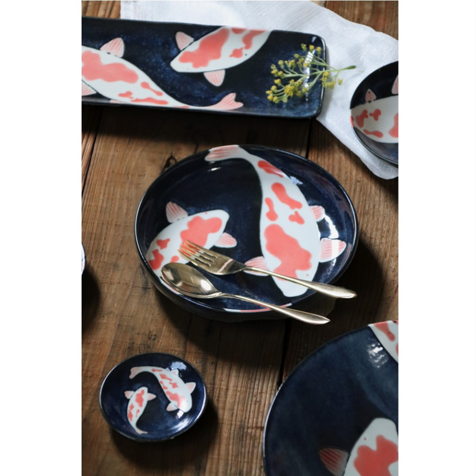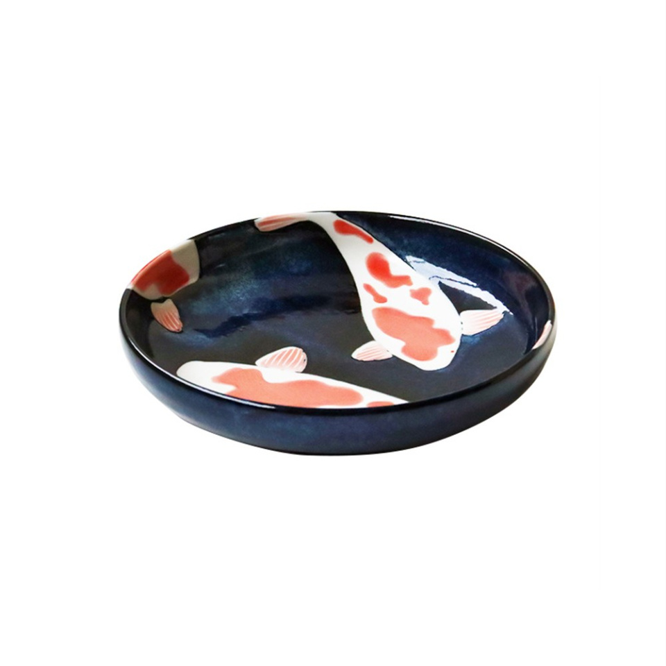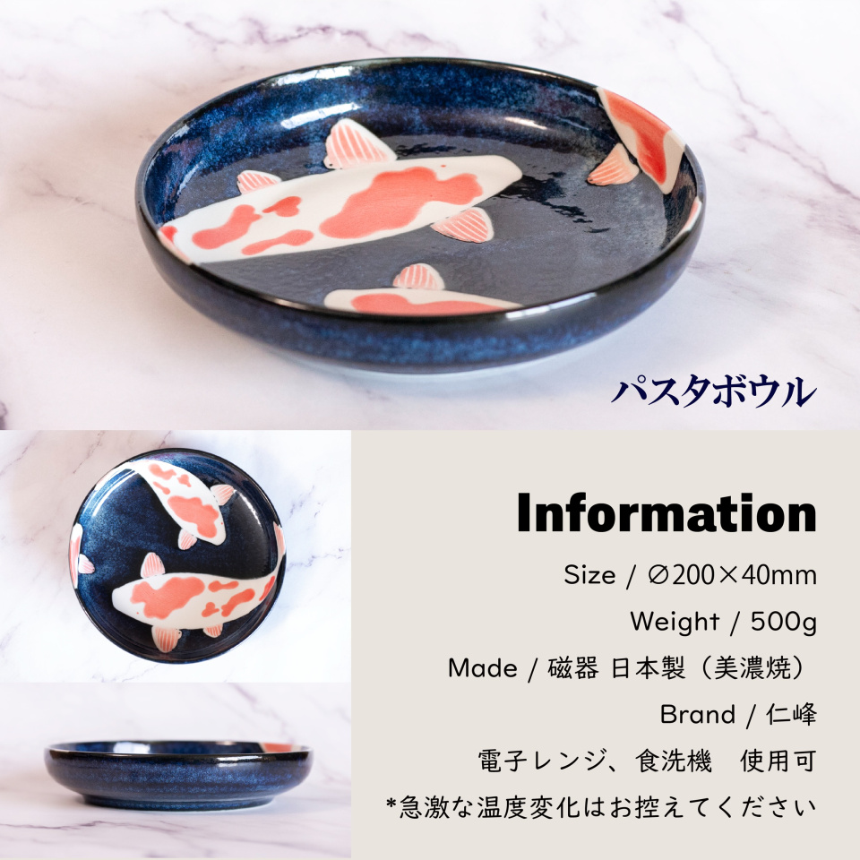 撥水の技法を用いて、錦鯉の赤と白の美しさがより際立つようにデザインしています。