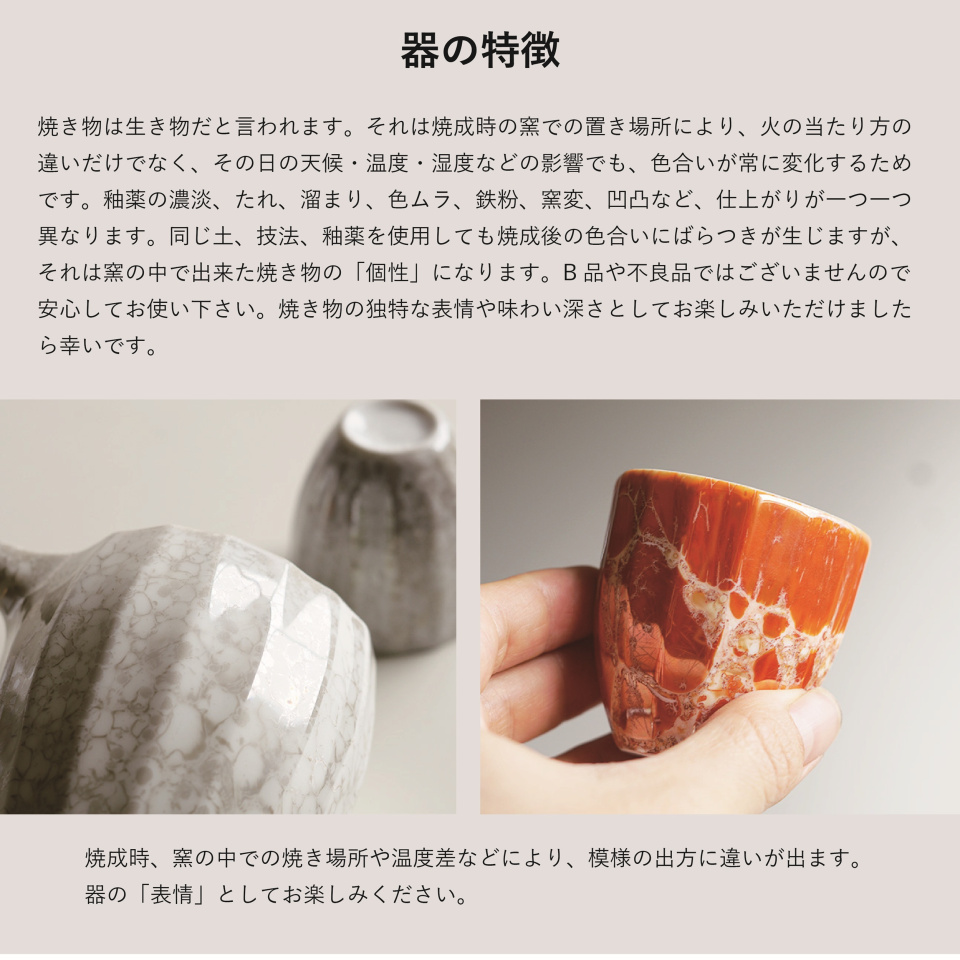 ・焼き物の性質上、鉄粉、色ムラ、釉垂れ、ピンホール、小キズ、多少のゆがみが発生する場合がございますが、 不良品ではございません。またご使用上の問題はございませんので、ご安心ください。