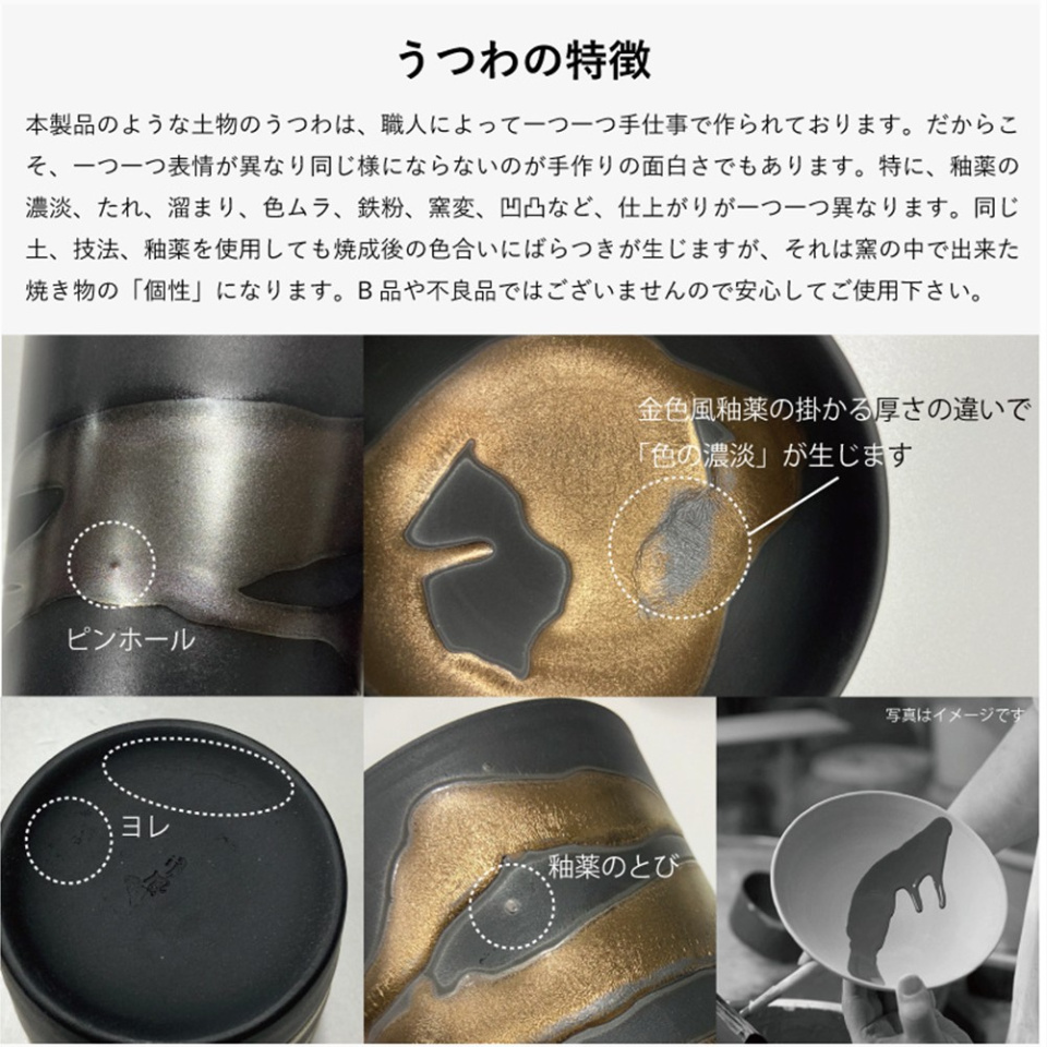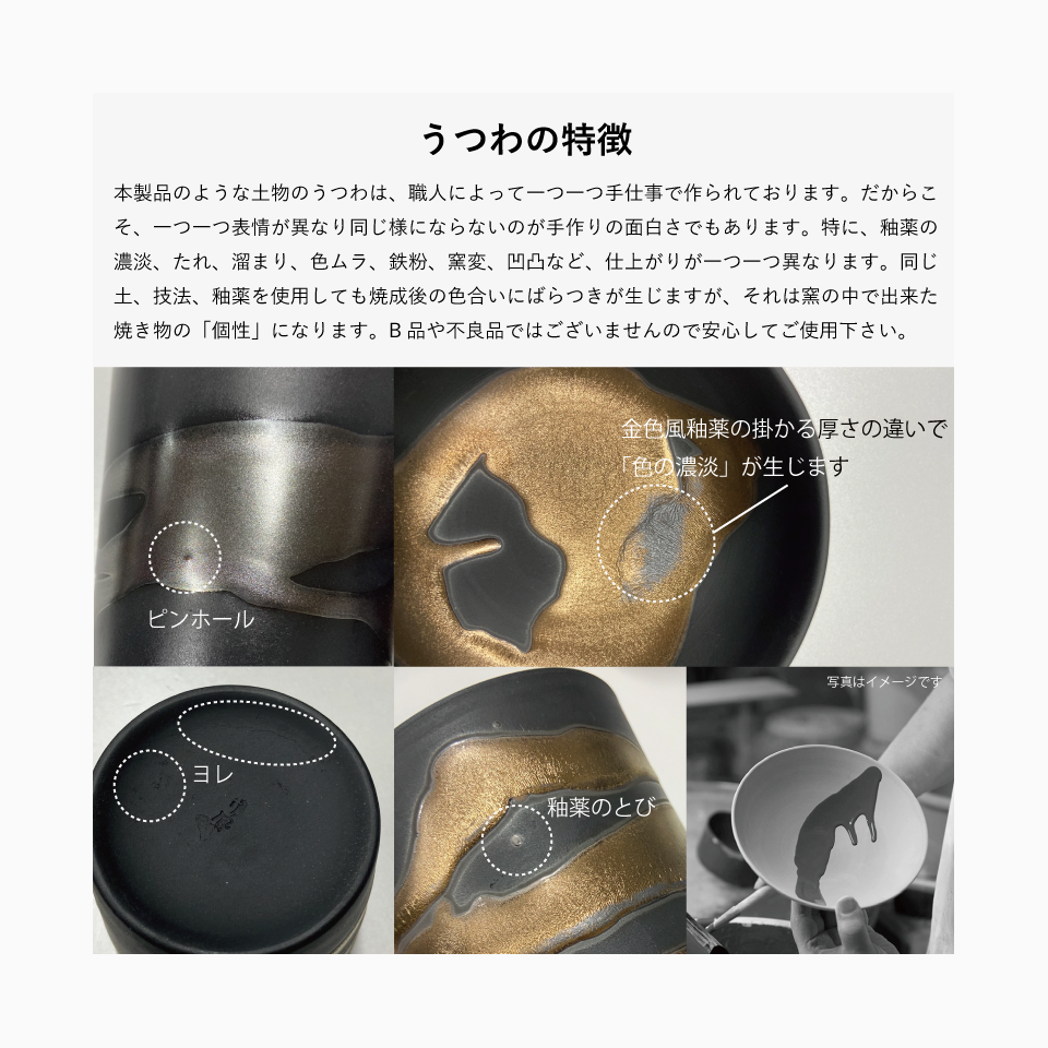 ・焼き物の性質上、鉄粉、色ムラ、釉垂れ、ピンホール、小キズ、多少のゆがみが発生する場合がございますが、 不良品ではございません。またご使用上の問題はございませんので、ご安心ください。