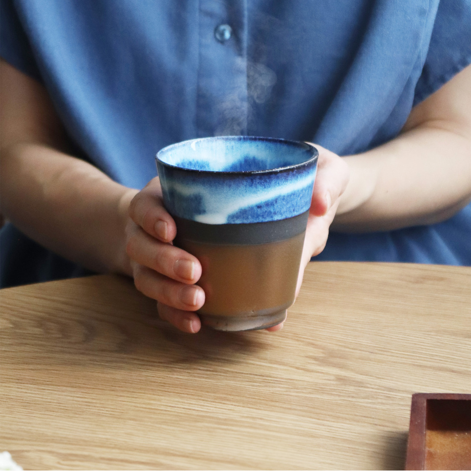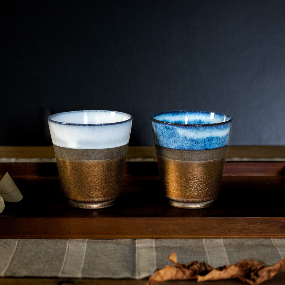 つやっとした白、青の釉薬の生地とゴールドのマットな質感が楽しめます。