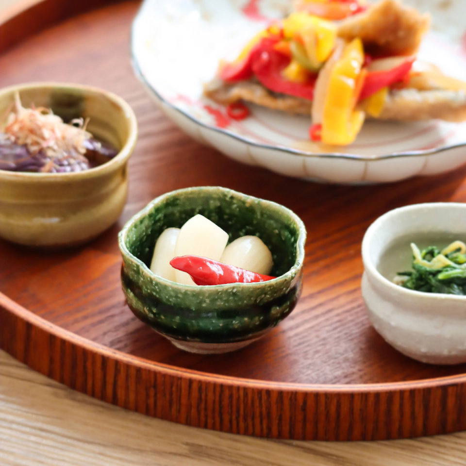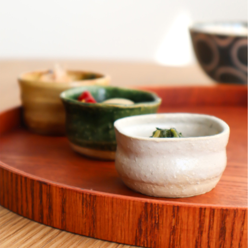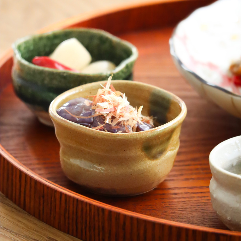 手のひらに収まるくらいの小さなぐい呑み珍味鉢は、薬味や漬物、一口おかずなど可愛らしく盛り付けられます。