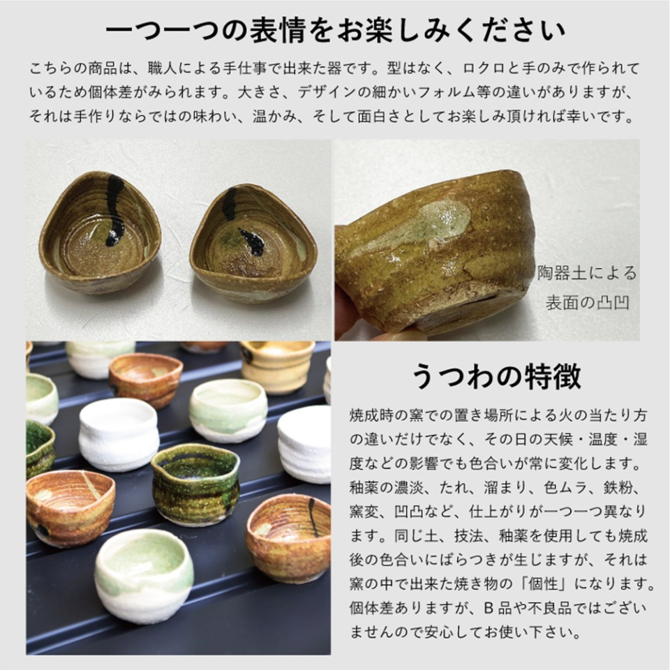 ・焼き物の性質上、鉄粉、色ムラ、釉垂れ、ピンホール、小キズ、多少のゆがみが発生する場合がございますが、 不良品ではございません。またご使用上の問題はございませんので、ご安心ください。