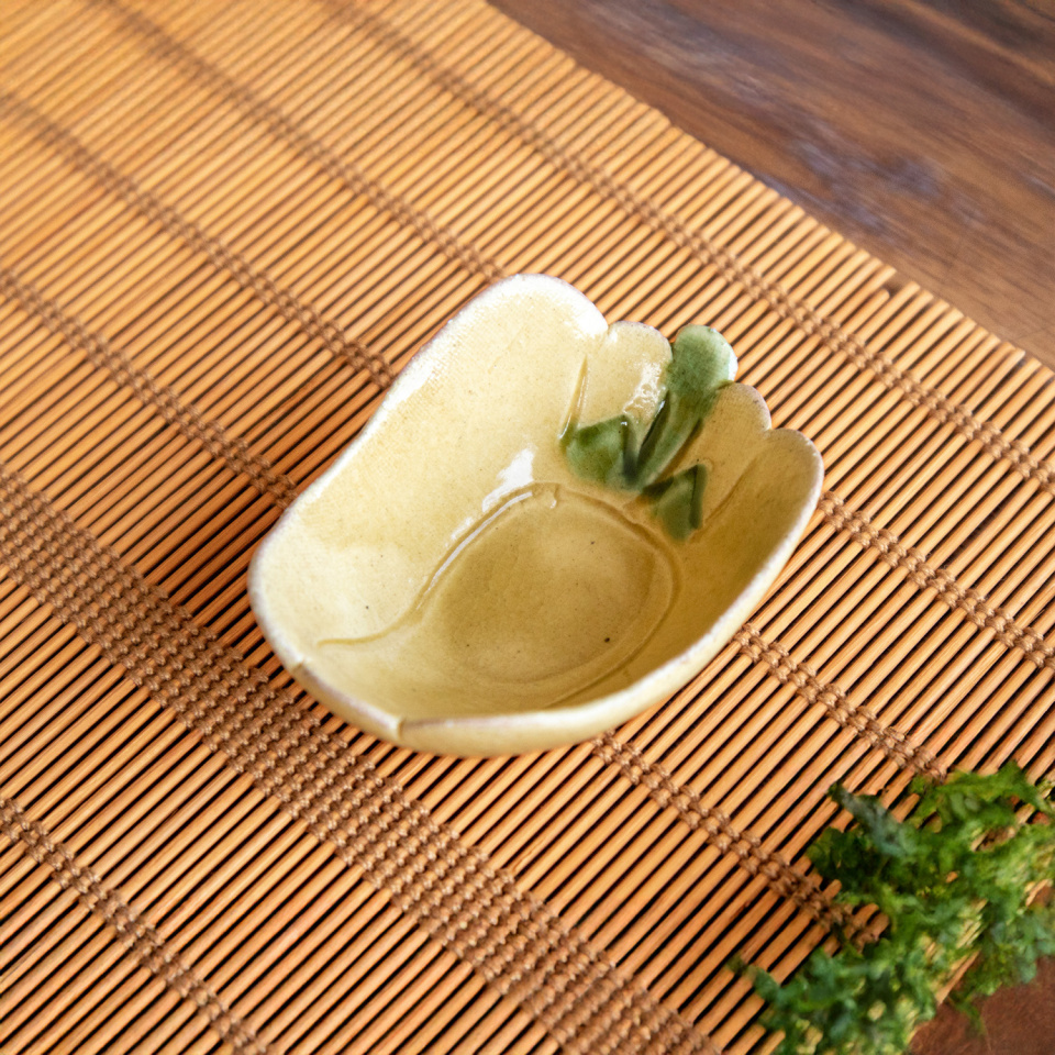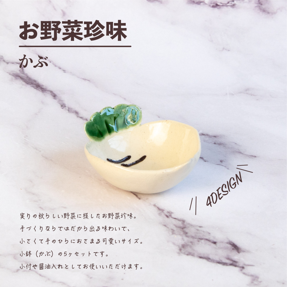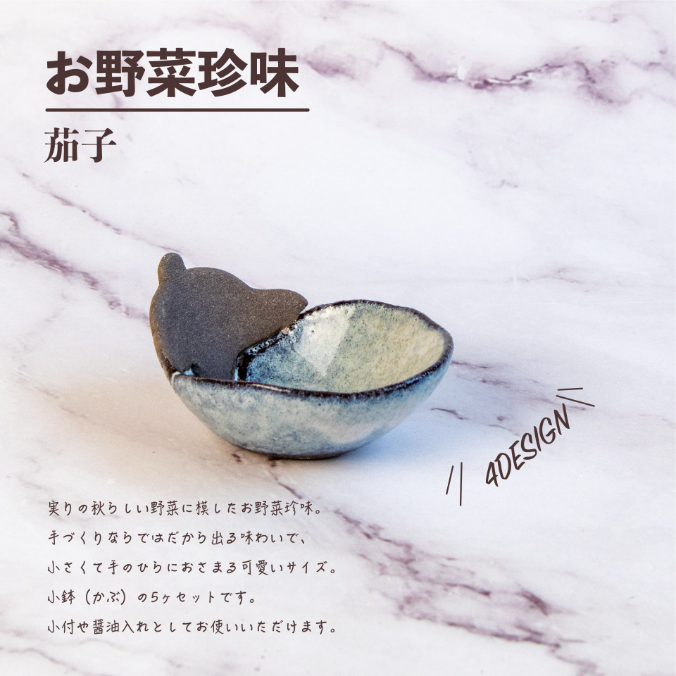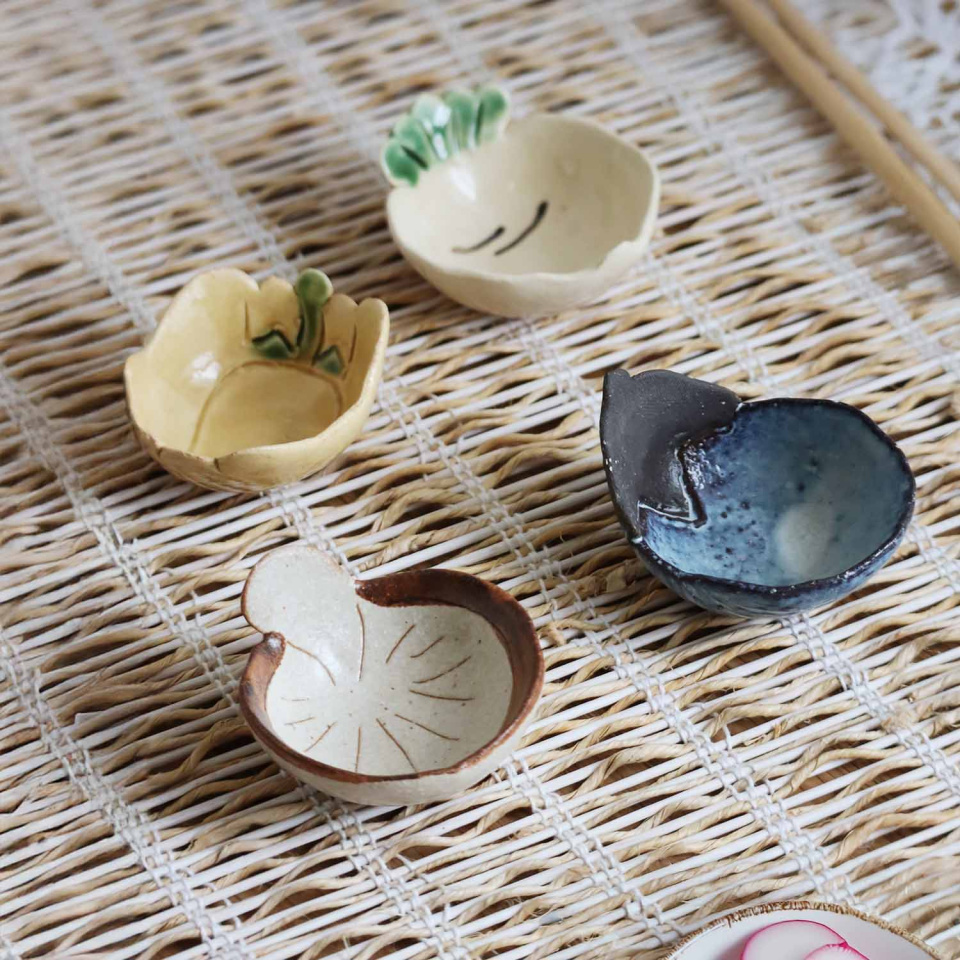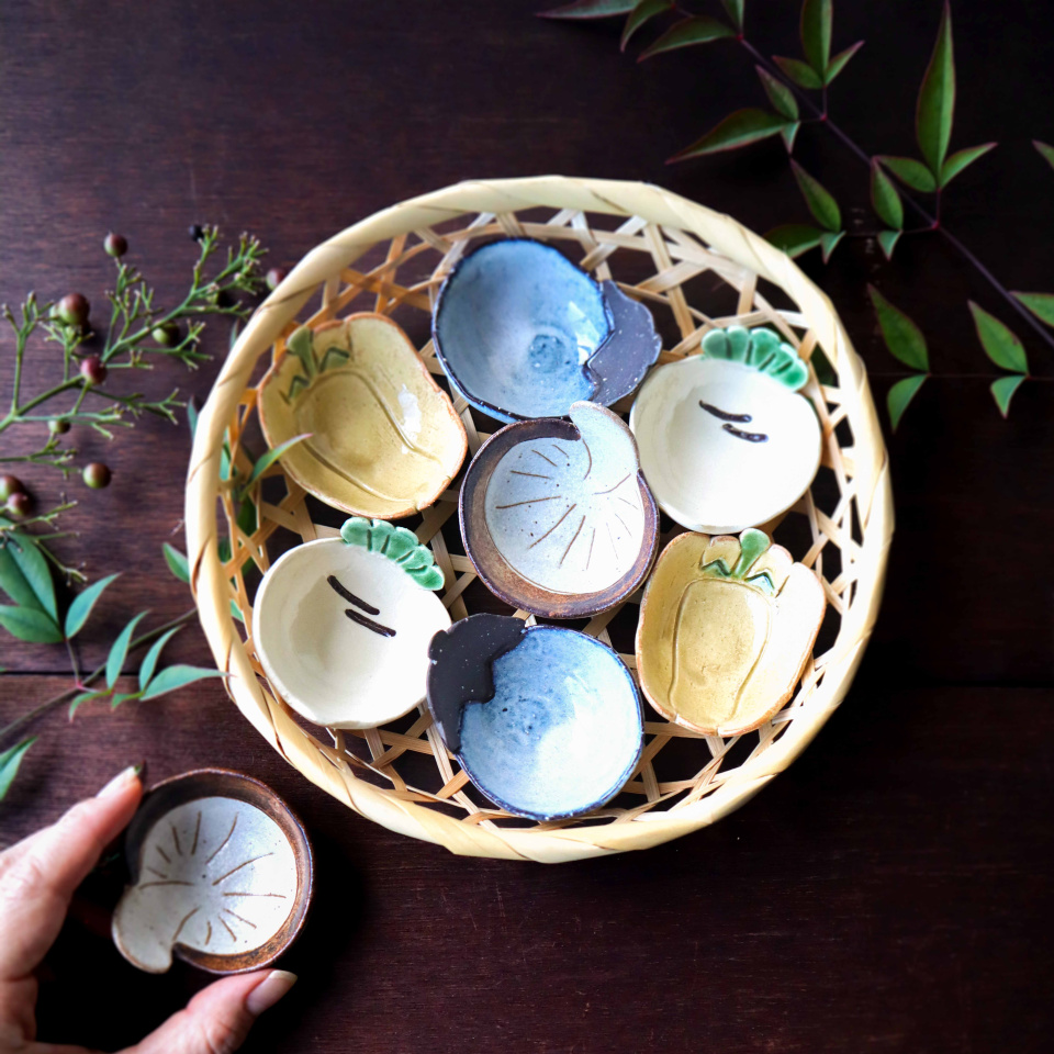 たたら成形という技法で一つひとつ丁寧に手作りされた、手のひらに収まるくらいに小さくて可愛いお野菜の形の小付けです。