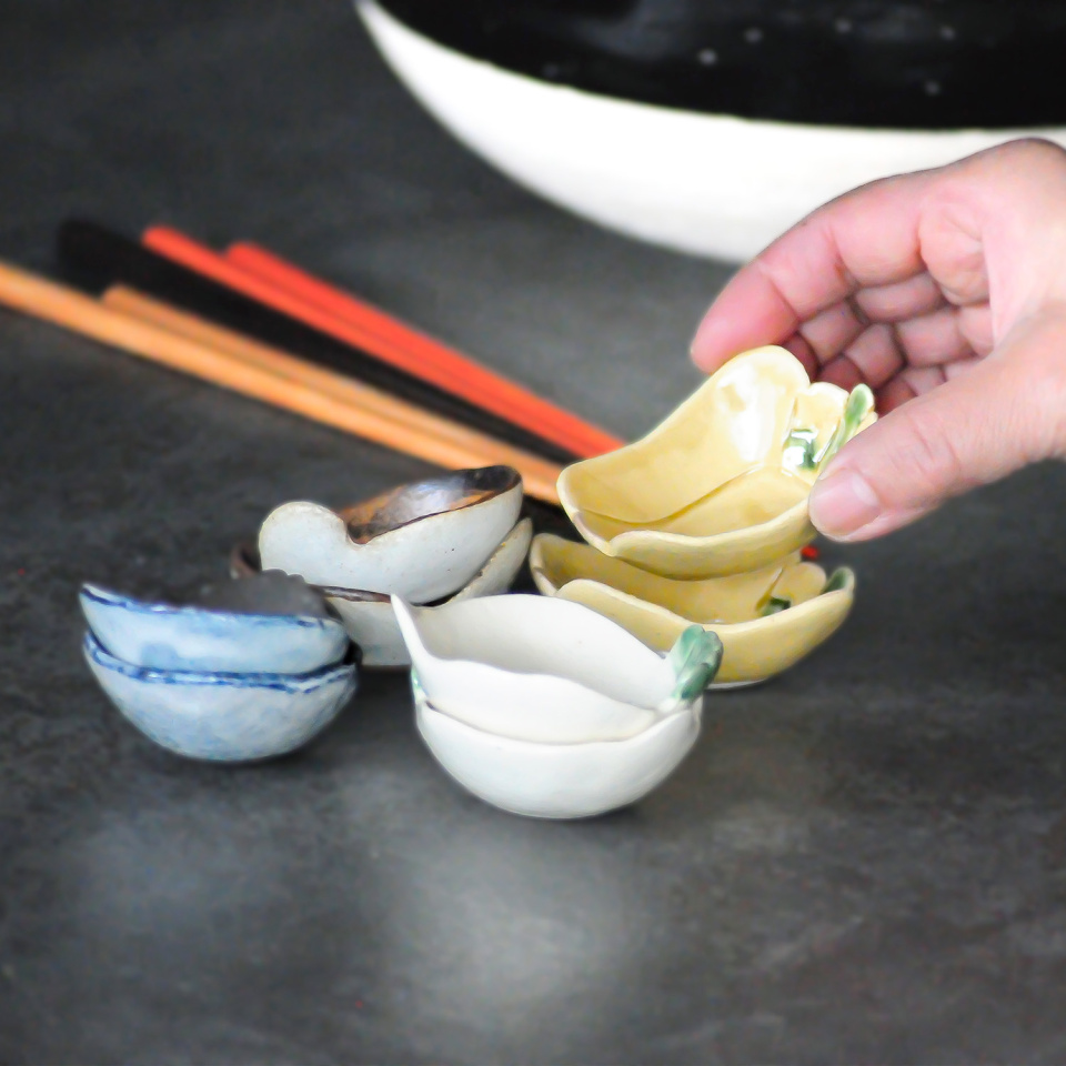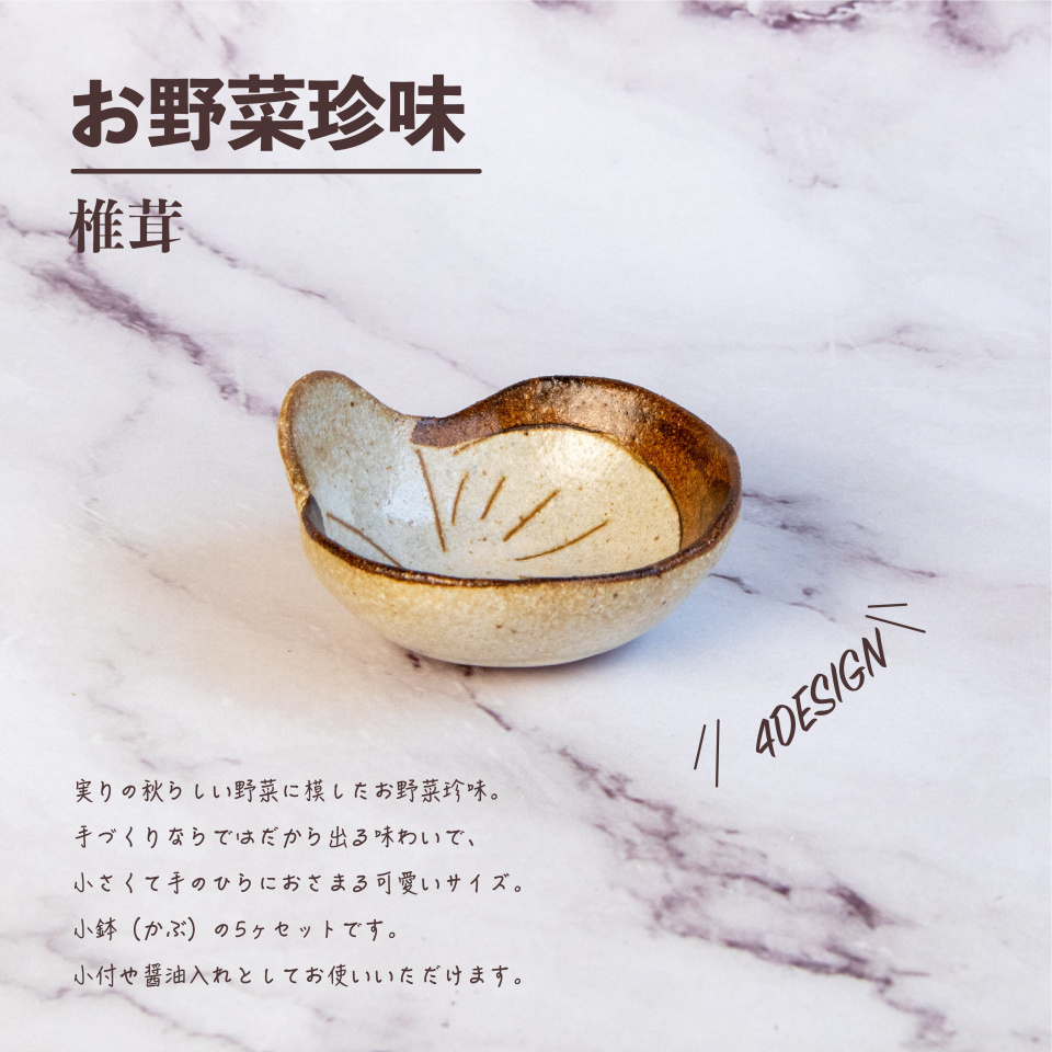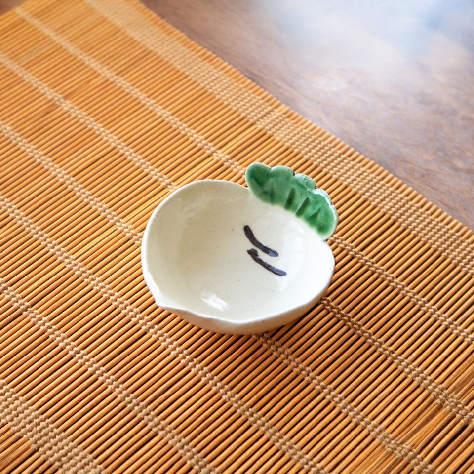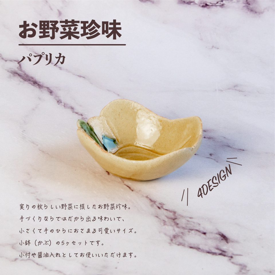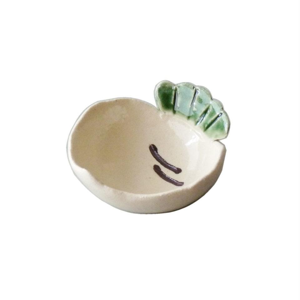 たたら成形という技法で一つひとつ丁寧に手作りされた、手のひらに収まるくらいに小さくて可愛いお野菜の形の小付けです。