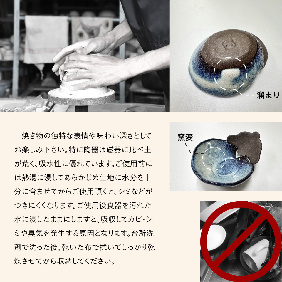 ・焼き物の性質上、鉄粉、色ムラ、釉垂れ、ピンホール、小キズ、多少のゆがみが発生する場合がございますが、 不良品ではございません。またご使用上の問題はございませんので、ご安心ください。