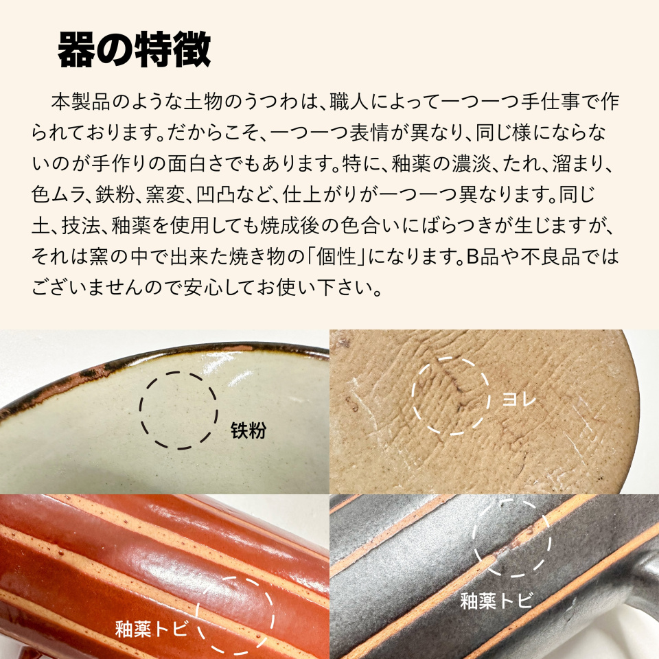 ・焼き物の性質上、鉄粉、色ムラ、釉垂れ、ピンホール、小キズ、多少のゆがみが発生する場合がございますが、 不良品ではございません。またご使用上の問題はございませんので、ご安心ください。