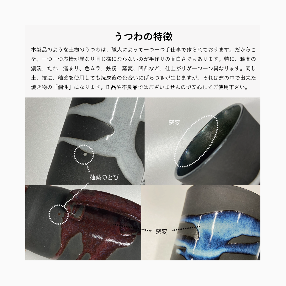 ・焼き物の性質上、鉄粉、色ムラ、釉垂れ、ピンホール、小キズ、多少のゆがみが発生する場合がございますが、 不良品ではございません。またご使用上の問題はございませんので、ご安心ください。