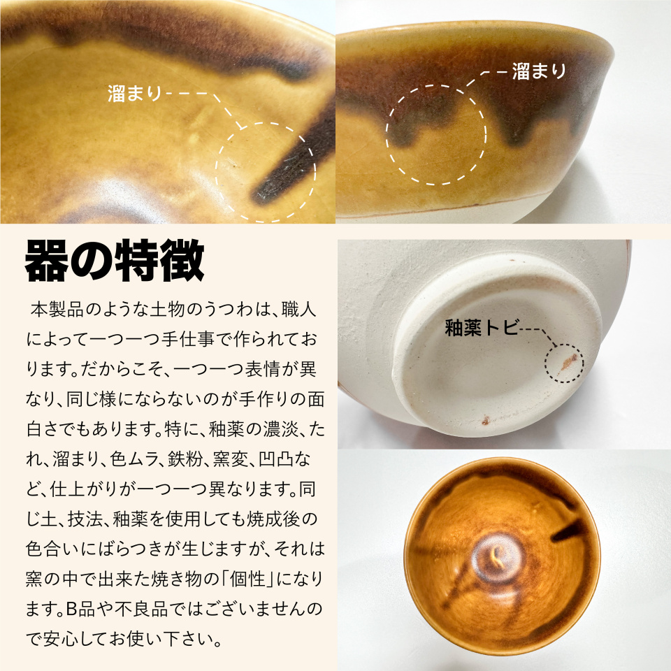 ・焼き物の性質上、鉄粉、色ムラ、釉垂れ、ピンホール、小キズ、多少のゆがみが発生する場合がございますが、 不良品ではございません。またご使用上の問題はございませんので、ご安心ください。